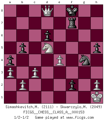 Last move : 1/2-1/2 2014 December 23 11:1:7 [Event "FICGS__CHESS__CLASS_A__000153"] [Site "FICGS"] [Date "2014.07.04"] [Round "1"] [White "Simashkevitch,Mykola"] [Black "Skwarczylo,Marek"] [Result "1/2-1/2"] [WhiteElo "2111"] [BlackElo "2049"] 1.e4 c5 2.Nf3 Nc6 3.d4 cxd4 4.Nxd4 Nf6 5.Nc3 e5 6.Ndb5 Bb4 7.a3 Bxc3+ 8.Nxc3 d6 9.Bg5 h6 10.Bxf6 Qxf6 11.Nd5 Qd8 12.Bc4 O-O 13.O-O Kh8 14.Qd2 f5 15.Rad1 f4 16.c3 Bd7 17.Ba2 b5 18.Qd3 a5 19.Rd2 Qb8 20.Bb3 Be8 21.Rb1 a4 22.Ba2 Bf7 23.Rbd1 Na5 24.Qf1 Ra7 25.f3 g6 26.Kh1 Kg7 27.Qf2 Bg8 28.Rd3 Rb7 29.Nb4 Bxa2 30.Nxa2 Nc4 31.Nb4 g5 32.Nd5 Qa7 33.Qe2 h5 34.Nb4 Rf6 35.Rg1 Kh8 36.Nd5 Rg6 37.g3 Rf7 38.R3d1 g4 39.gxf4 exf4 40.Rdf1 Ne5 41.Qe1 Qd7 42.fxg4 Rxg4 43.Rxg4 Qxg4 44.Qd2 f3 45.Qh6+ Kg8 46.Rg1 f2 47.Rxg4+ Nxg4 48.Qg5+ Kf8 49.Qd8+ 1/2-1/2 Sicilian : Pelikan (Lasker/Sveshnikov) variation Kingside Castling by player Black (move 12) Kingside Castling by player White (move 13) This chess game ended in a draw. Follow this game move after move (download)The Chess pieces are the block alphabet which shapes thoughts; and these thoughts, although making a visual design on the chessboard, express their beauty abstractly, like a poem. (Marcel Duchamp) Aljechin war kein Nazi. Er war ein Opportunist. Ein schrecklicher Mann. Er liebte Geld über alles und würde für Geld ein Jude, ein Katolik oder ein Protestant werden. (Miguel Najdorf) Preferería tener un Peón que un dedo. (Reuben Fine) Toutes les manuvres exécutées sur une colonne ouverte ont pour but ultime l'intrusion définitive sur la septième ou la huitième rangée, en plein cur de la position ennemie. (Aaron Nimzovitch) Those who make the worst use of their time are the first to complain of its brevity. (Jean de la Bruyere)
