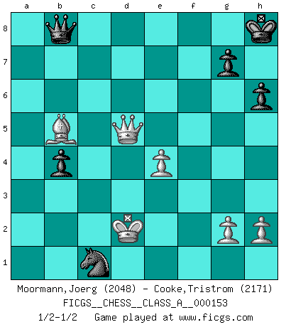 Last move : 1/2-1/2 2014 December 11 12:24:46 [Event "FICGS__CHESS__CLASS_A__000153"] [Site "FICGS"] [Date "2014.07.04"] [Round "1"] [White "Moormann,Joerg"] [Black "Cooke,Tristrom"] [Result "1/2-1/2"] [WhiteElo "2048"] [BlackElo "2171"] 1.d4 d5 2.c4 c6 3.Nc3 dxc4 4.e4 b5 5.a4 a6 6.axb5 cxb5 7.Nxb5 axb5 8.Rxa8 Bb7 9.Ra2 e6 10.f3 Nc6 11.b3 Bb4+ 12.Kf2 Bc5 13.Ne2 f5 14.bxc4 fxe4 15.Qb3 Nxd4 16.Nxd4 Bxd4+ 17.Ke1 Ne7 18.fxe4 b4 19.c5 O-O 20.Qxe6+ Kh8 21.Bb5 Nd5 22.Rf1 Nc3 23.Rxf8+ Qxf8 24.Qd7 Nxa2 25.Qxd4 Nxc1 26.Qd6 Qa8 27.c6 h6 28.cxb7 Qxb7 29.Qd5 Qb8 30.Kd2 1/2-1/2 QGD Slav defense, Alekhine variation Kingside Castling by player Black (move 19) This chess game ended in a draw. Follow this game move after move (download)Don't even mention losing to me. I can't stand to think of it. (Bobby Fischer) Ich habe kein Problem mit Frauen, sondern nur mit dem Niveau ihres Schachspiels (Judith Polgar) En el tablero, la mentira e hipocresía no sobreviven mucho. (Emanuel Lasker) Les Echecs représentent une sphère d'idées créatrices basée sur la volonté des deux protagonistes. (Smyslov) A generalist learns less and less about more and more until he knows nothing about everything. (Author unknown)
