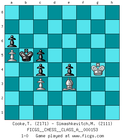 Last move : 1-0 2015 April 26 22:20:25 [Event "FICGS__CHESS__CLASS_A__000153"] [Site "FICGS"] [Date "2014.07.04"] [Round "1"] [White "Cooke,Tristrom"] [Black "Simashkevitch,Mykola"] [Result "1-0"] [WhiteElo "2171"] [BlackElo "2111"] 1.e4 e5 2.Nf3 Nc6 3.Bc4 Bc5 4.c3 Nf6 5.d4 exd4 6.e5 d5 7.Bb5 Ne4 8.cxd4 Bb6 9.Nc3 O-O 10.Be3 Bg4 11.h3 Bh5 12.Qc2 Bxf3 13.gxf3 Ng5 14.Bxc6 bxc6 15.Qf5 f6 16.O-O-O fxe5 17.Qxg5 Qxg5 18.Bxg5 Bxd4 19.f4 h6 20.Bh4 Rxf4 21.Bg3 Rf3 22.Rhe1 Raf8 23.Rd2 R8f5 24.Nd1 Kf7 25.Rc2 c5 26.Ne3 Bxe3+ 27.Rxe3 Rxe3 28.fxe3 Ke6 29.e4 Rf3 30.exd5+ Kxd5 31.Rc3 Rxc3+ 32.bxc3 g5 33.Kd2 Ke4 34.Ke2 c6 35.a4 h5 36.a5 a6 37.Bf2 Kd5 38.Kd3 c4+ 39.Kd2 g4 40.hxg4 hxg4 41.Ke2 e4 42.Be3 c5 43.Kf2 Kc6 44.Kg3 Kb5 45.Kxg4 1-0 Giuoco Piano Kingside Castling by player Black (move 9) Queenside Castling by player White (move 16) 10 pieces endgame at move 40 : White KBPP , Black KPPPPP WHITE : King + 1 Bishop 2 Pawns BLACK : King + 5 Pawns 9 pieces endgame at move 45 : White KBPP , Black KPPPP WHITE : King + 1 Bishop 2 Pawns BLACK : King + 4 Pawns Player White won this chess game. Follow this game move after move (download)Tactics flow from a superior position. (Bobby Fischer) Irgendwie scheint mir sonntags früh um 9 Uhr der Killerinstinkt verloren gegangen zu sein. (Alexej Shirov) Cuando tengo las piezas blancas, yo gano porque soy blanco; Cuando tengo las piezas negras, yo gano porque soy Bogolyubov. (Bogolyubov) Dans le domaine de la peinture, de la gravure et de la sculpture, dès la première décennie de notre siècle, les artistes abandonnent la représentation de la partie d'échecs pour se concentrer sur les pièces, sur les échiquiers et sur toutes les variations auxquelles les unes et les autres peuvent donner lieu. On passe en quelque sorte d'un thème social à un thème musical (au sens de la musica médiévale, c'est-à-dire d'une notion qui inclue le rythme, l'harmonie, la construction et la déconstruction, etc.). Graphiquement et picturalement, l'échiquier apparaît comme une structure ouverte, dynamique, d'une richesse infinie, autorisant toutes les combinatoires et débouchant sur des mouvements et des rythmes de nature exponentielle. (Michel Pastoureau) A cynic is a man who knows the price of everything but the value of nothing. (Oscar Wilde)