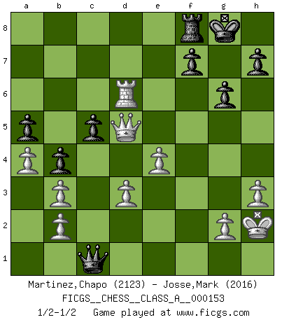 Last move : 1/2-1/2 2014 August 11 17:17:21 [Event "FICGS__CHESS__CLASS_A__000153"] [Site "FICGS"] [Date "2014.07.04"] [Round "1"] [White "Martinez,Chapo"] [Black "Josse,Mark"] [Result "1/2-1/2"] [WhiteElo "2123"] [BlackElo "2016"] 1.e4 e5 2.Nf3 Nc6 3.Bb5 a6 4.Ba4 Nf6 5.O-O Be7 6.d3 b5 7.Bb3 d6 8.a3 O-O 9.Nc3 Bg4 10.Be3 Nd4 11.Bxd4 exd4 12.Nd5 Nd7 13.h3 Bxf3 14.Qxf3 c6 15.Nf4 a5 16.a4 b4 17.Rae1 Ne5 18.Qd1 Nd7 19.Qg4 Ne5 20.Qg3 Bh4 21.Qh2 Qg5 22.Kh1 Qf6 23.Nh5 Qg6 24.Ng3 Bxg3 25.fxg3 Nd7 26.Qg1 Nc5 27.Qxd4 Nxb3 28.cxb3 Qxg3 29.Rc1 c5 30.Qd5 Rae8 31.Rf5 g6 32.Rf6 Re6 33.Rcf1 Rxf6 34.Rxf6 Qe3 35.Rxd6 Qc1+ 36.Kh2 Qf4+ 37.Kg1 Qc1+ 38.Kh2 1/2-1/2 Ruy Lopez : Closed defense Kingside Castling by player White (move 5) Kingside Castling by player Black (move 8) This chess game ended in a draw. Follow this game move after move (download)By the beauty of his games, the clarity of his play, and the brilliance of his ideas, Fischer made himself an artist of the same stature as Brahms, Rembrandt, and Shakespeare. (David Levy) Wer mein Gambit spielt, muß bereit sein, alle Brücken hinter sich abzubrechen. Es verändert den ganzen Menschen. Es wirkt wie ein Zauberstab und fördert verkümmerte, gute Charakter- eigenschaften wieder zu Tage. (Emil Joseph Diemer) Yo siempre he tenido un ligero sentimiento de lástima por una persona que no tiene conocimiento del Ajedrez. (Siegbert Tarrasch) En blitz, le Cavalier l'emporte sur le Fou. (Vlastimil Hort) The best teachers teach from the heart, not from the book. (Author unknown)