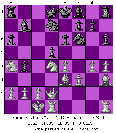Last move : 1-0 2014 July 8 14:53:45 [Event "FICGS__CHESS__CLASS_A__000153"] [Site "FICGS"] [Date "2014.07.04"] [Round "1"] [White "Simashkevitch,Mykola"] [Black "Lubas,Jozef"] [Result "1-0"] [WhiteElo "2111"] [BlackElo "2023"] 1.e4 c5 2.Nf3 d6 3.d4 cxd4 4.Nxd4 Nf6 5.Nc3 a6 6.Be3 e6 7.f3 b5 8.Qd2 Nbd7 9.g4 h6 10.O-O-O Bb7 11.h4 b4 12.Na4 d5 13.Bh3 1-0 Sicilian : Najdorf, Byrne (English) attack Queenside Castling by player White (move 10) Player White won this chess game. Follow this game move after move (download)All I want to do, ever, is just play Chess. (Bobby Fischer) Capablanka war das größte Genie der Schachgeschichte! Aber denken sie nicht er habe nichts vom Schach verstanden. Er wusste nur soviel wie er wissen musste um seine Ziele zu erreichen. (Mikhail Moiseyevich Botvinik) Yo he agregado estos principios a la ley: pongan los Caballos en acción antes de que los dos Alfiles sean desarrollados. (Emanuel Lasker) Roi des jeux et jeu des rois, les échecs portent en eux un sentiment d'infini. Ils donnent à celui qui s'est efforcé d'en approfondir les arcanes l'impression de n'être pas à la mesure de l'homme; en fait, ils constituent un résumé de l'univers, un microcosme, et figurent cette grande échelle qui, dans les plans de la lumière descend jusqu'à la matière, qui des abîmes insondables remonte jusqu'en l'infini de Dieu. (Pyrame) Beta. Software undergoes beta testing shortly before it's released. Beta is latin for still doesn't work. (Anonymous)