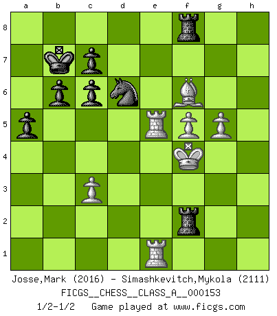 Last move : 1/2-1/2 2014 November 7 19:47:6 [Event "FICGS__CHESS__CLASS_A__000153"] [Site "FICGS"] [Date "2014.07.04"] [Round "1"] [White "Josse,Mark"] [Black "Simashkevitch,Mykola"] [Result "1/2-1/2"] [WhiteElo "2016"] [BlackElo "2111"] 1.e4 e5 2.Nf3 Nc6 3.d4 exd4 4.Nxd4 Bc5 5.Nxc6 Qf6 6.Qf3 dxc6 7.Nc3 Be6 8.Be3 Bb4 9.Qxf6 Nxf6 10.f3 Bxc3+ 11.bxc3 a5 12.Bd3 O-O-O 13.a3 Nd7 14.f4 f6 15.Rb1 Rhe8 16.Kf2 Ba2 17.Rb2 Bf7 18.g4 g5 19.fxg5 Ne5 20.Be2 Bc4 21.Bd1 Be6 22.Bf4 Nc4 23.Rb1 fxg5 24.Bxg5 Rd7 25.Kg3 Nxa3 26.Ra1 Nc4 27.Be2 b6 28.h3 Nd6 29.Bf3 Bc4 30.Rhe1 Nf7 31.Bf6 Rd2 32.g5 Rxc2 33.Bg4+ Be6 34.Bf5 Bxf5 35.exf5 Rf8 36.Re7 Nd6 37.Kg4 h6 38.h4 hxg5 39.hxg5 Rf2 40.Re5 Kb7 41.Rae1 Rg2+ 42.Kf4 Rf2+ 1/2-1/2 Scotch game Queenside Castling by player Black (move 12) This chess game ended in a draw. Follow this game move after move (download)Many Chess players were surprised when after the game, Fischer quietly explained: 'I had already analyzed this possibility' in a position which I thought was not possible to foresee from the opening. (Mikhail Tal) Kleine Schachspieler machen Mist, und große Schachspieler machen Mist, aber große machen weniger Mist. (Fritz Sämisch) No nos podemos resistir a la fascinación de un sacrificio ya que la pasión por los sacrificios es parte de la naturaleza de un jugador de Ajedrez. (Rudolf Spielman) Le jeu d'échecs est comme rejeté hors du temps. (Antoine de Saint-Exupéry) Pretend inferiority and encourage his arrogance. (Sun Tzu)