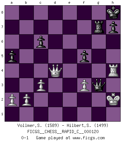 Last move : 0-1 2014 August 8 16:10:46 [Event "FICGS__CHESS__RAPID_C__000120"] [Site "FICGS"] [Date "2014.07.07"] [Round "1"] [White "Vollmer,Steve"] [Black "Hilbert,Stephan J."] [Result "0-1"] [WhiteElo "1589"] [BlackElo "1499"] 1.e4 d5 2.exd5 Qxd5 3.Nc3 Qa5 4.d4 Nf6 5.Nf3 Bf5 6.Bd2 c6 7.Bc4 e6 8.O-O Bd6 9.d5 cxd5 10.Nxd5 Qd8 11.Bb5+ Nc6 12.Bxc6+ bxc6 13.Ne3 Bg6 14.Bc3 O-O 15.Qe2 Qc7 16.Bxf6 gxf6 17.h3 Kh8 18.c3 Rg8 19.Rad1 Bh5 20.Nc4 Bf4 21.Ncd2 Rad8 22.Ne4 Be5 23.Qe3 Bf4 24.Qe2 Be5 25.Rxd8 Qxd8 26.Rd1 Qc7 27.Kh1 a5 28.g4 Bg6 29.Nxe5 Qxe5 30.Ng3 Qc5 31.Rd4 f5 32.Qd2 fxg4 33.hxg4 f5 34.Qg5 Qf8 35.gxf5 Bxf5 36.Qh5 Rg6 37.Nxf5 exf5 38.Rh4 Qg7 39.Qd1 Qe7 40.Qd4+ Rg7 41.f3 Qe1+ 42.Kh2 Qg3+ 0-1 Scandinavian defense Kingside Castling by player White (move 8) Kingside Castling by player Black (move 14) Player Black won this chess game. Follow this game move after move (download)A strong memory, concentration, imagination, and a strong will is required to become a great Chess player. (Bobby Fischer) Kostenjuk hat keinen Sexappeal. (Loek van Wely) El Ajedrez es el gimnasio de la mente. (Blaise Pascal) On peut tirer plus d'utilité d'une partie perdue que de 100 parties gagnées. (Capablanca) Man is still the most extraordinary computer of all. (John F. Kennedy)