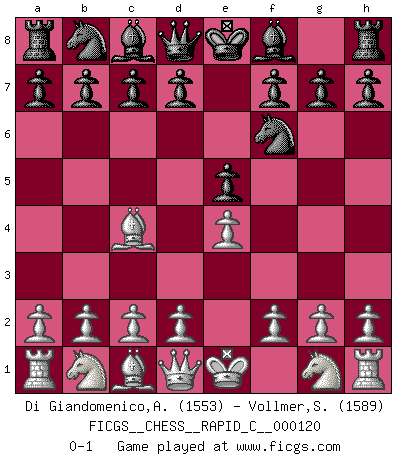 Last move : 0-1 2014 August 8 16:9:28 [Event "FICGS__CHESS__RAPID_C__000120"] [Site "FICGS"] [Date "2014.07.07"] [Round "1"] [White "Di Giandomenico,Alfonso"] [Black "Vollmer,Steve"] [Result "0-1"] [WhiteElo "1553"] [BlackElo "1589"] 1.e4 e5 2.Bc4 Nf6 0-1 This chess game has been lost on time (started : 2014.07.07 12:44:41) Bishop's Opening : Berlin defense Player Black won this chess game. Follow this game move after move (download)You cannot play at Chess if you are kind-hearted. (French Proverb) Ich liebe den Moment, wenn ich das Ego meines Gegenüber breche. (Robert James Fischer) El Ajedrez es una guerra en un tablero. El objetivo es aplastar la mente del oponente. (Bobby Fischer) Il s'avisa de me proposer d'apprendre les échecs qu'il jouait un peu... me voilà forcené des échecs. J'achète un échiquier, je m'enferme dans ma chambre, j'y passe des jours et des nuits à vouloir apprendre par cur toutes les parties. (Jean-Jacques Rousseau, Confessions) SEO proverb : Make your website optimized for human beings, not for search engines.