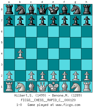 Last move : 1-0 2014 August 10 16:23:41 [Event "FICGS__CHESS__RAPID_C__000120"] [Site "FICGS"] [Date "2014.07.07"] [Round "1"] [White "Hilbert,Stephan J."] [Black "Benone,Mateia"] [Result "1-0"] [WhiteElo "1499"] [BlackElo "1289"] 1.b4 1-0 This chess game has been lost on time (started : 2014.07.07 12:44:41) Polish (Sokolsky) opening Player White won this chess game. Follow this game move after move (download)Chess is a sea in which a gnat may drink and an elephant may bathe. (Hindu proverb) Ich möchte Schüler heranbilden, die das Vermögen haben, selbst zu denken und Kritik zu üben. (Emanuel Lasker) El Rey es una pieza de pelea. ¡Usenlo!. (Wilhelm Steinitz) Psychologiquement, tu dois avoir confiance en toi même, mais cette confiance doit être basée sur des faits. (Robert Fischer) Only sick music makes money today. (Friedrich Nietzsche)