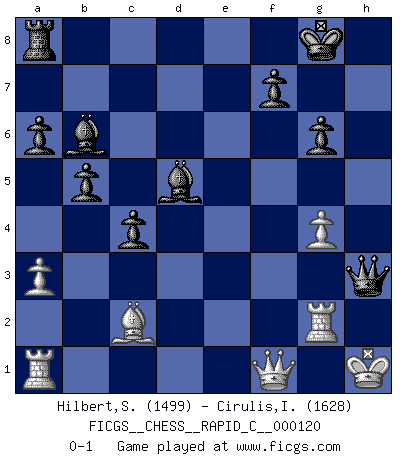 Last move : 0-1 2014 August 14 19:53:33 [Event "FICGS__CHESS__RAPID_C__000120"] [Site "FICGS"] [Date "2014.07.07"] [Round "1"] [White "Hilbert,Stephan J."] [Black "Cirulis,Ilmars"] [Result "0-1"] [WhiteElo "1499"] [BlackElo "1628"] 1.b4 e5 2.Bb2 Bxb4 3.Bxe5 Nf6 4.e3 d5 5.a3 Ba5 6.Nf3 O-O 7.c4 c6 8.Be2 Nbd7 9.Bb2 dxc4 10.Bxc4 b5 11.Bb3 c5 12.O-O c4 13.Bc2 Bb7 14.Nc3 a6 15.d4 Re8 16.Ng5 g6 17.h4 Qe7 18.e4 h6 19.e5 hxg5 20.hxg5 Nh7 21.f4 Nxg5 22.fxg5 Nxe5 23.Nd5 Bxd5 24.dxe5 Qxg5 25.Rf2 Rxe5 26.Bxe5 Qxe5 27.Qf1 Bc7 28.g4 Qg3+ 29.Rg2 Bb6+ 30.Kh1 Qh3+ 0-1 Polish (Sokolsky) opening Kingside Castling by player Black (move 6) Kingside Castling by player White (move 12) Player Black won this chess game. Follow this game move after move (download)There are two types of sacrifices: correct ones and mine. (Mikhail Tal) Wenn ich gewinne bin ich ein Genie. Wenn nicht, dann bin ich keines. (Robert James Fischer) La enorme capacidad mental, en la que sin ella no puede un jugador de Ajedrez existir, es demasiado requerida por el Ajedrez al grado de que nunca podrá liberar su mente de este juego. (Albert Einstein) On croit qu'il y a plus de mauvais joueurs que de bons joueurs, c'est faux : Il y a autant de joueurs qui gagnent que de joueurs qui perdent. (Philippe Geluck) Life is pain my dear and anyone who says otherwise is selling something. (Princess Bride)