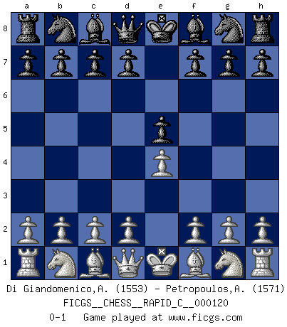 Last move : 0-1 2014 August 8 16:9:28 [Event "FICGS__CHESS__RAPID_C__000120"] [Site "FICGS"] [Date "2014.07.07"] [Round "1"] [White "Di Giandomenico,Alfonso"] [Black "Petropoulos,Athanasios"] [Result "0-1"] [WhiteElo "1553"] [BlackElo "1571"] 1.e4 e5 0-1 This chess game has been lost on time (started : 2014.07.07 12:44:41) King's pawn game Player Black won this chess game. Follow this game move after move (download)Pawns are born free, yet they are everywhere in chains. (Rick Kennedy) Vom Schach wurde gesagt das Leben sei dafür nicht lange genug. Aber das ist der Fehler des Lebens, nicht des Schach'. (Irving Chernev) Los Peones son nacidos libres, y aún así, se encuentran encadenados por todos lados. (Rick Kennedy) A chaque perte on perd un peu de soi. (Joël Lautier) But they are useless. They can only give you answers. (Pablo Picasso, about computers)
