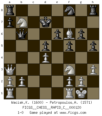 Last move : 1-0 2014 July 29 15:51:14 [Event "FICGS__CHESS__RAPID_C__000120"] [Site "FICGS"] [Date "2014.07.07"] [Round "1"] [White "Waciak,Karol"] [Black "Petropoulos,Athanasios"] [Result "1-0"] [WhiteElo "1600"] [BlackElo "1571"] 1.e4 c6 2.d4 d5 3.e5 Bf5 4.Nf3 g6 5.c4 Bg7 6.Nc3 e6 7.h3 h5 8.Be2 f6 9.O-O Nd7 10.Bd3 Bxd3 11.Qxd3 Nf8 12.cxd5 cxd5 13.Nb5 f5 14.Nd6 Ke7 15.Bg5 Nf6 16.Qa3 Kd7 17.Nxb7 Qb6 18.exf6 Bxf6 19.Bxf6 1-0 Caro-Kann : Advance variation Kingside Castling by player White (move 9) Player White won this chess game. Follow this game move after move (download)Chess makes man wiser and clear-sighted. (Vladimir Putin) Ich habe kein Problem mit Frauen, sondern nur mit dem Niveau ihres Schachspiels (Judith Polgar) El Ajedrez es una guerra en un tablero. El objetivo es aplastar la mente del oponente. (Bobby Fischer) Mon pion favori sur ma case favorite ! Bronstein en parlant d'un coup de pion en h5 quand il avait les Noirs. A journey of a thousand sites begins with a single click. (Author unknown)