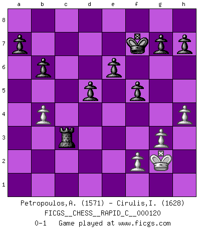 Last move : 0-1 2014 August 24 15:53:20 [Event "FICGS__CHESS__RAPID_C__000120"] [Site "FICGS"] [Date "2014.07.07"] [Round "1"] [White "Petropoulos,Athanasios"] [Black "Cirulis,Ilmars"] [Result "0-1"] [WhiteElo "1571"] [BlackElo "1628"] 1.d4 f5 2.e3 Nf6 3.c4 e6 4.Nf3 Be7 5.Be2 O-O 6.O-O b6 7.Nc3 Bb7 8.a3 c5 9.Rb1 Ne4 10.Qc2 Nxc3 11.Qxc3 Be4 12.Ra1 Bf6 13.Qd2 Nc6 14.Ra2 Bxf3 15.Bxf3 cxd4 16.exd4 Rc8 17.b4 Nxd4 18.Qe3 Nxf3+ 19.Qxf3 Rxc4 20.Bb2 Bxb2 21.Rxb2 d5 22.Re1 Qf6 23.Qe2 Re4 24.Qd2 Qxb2 25.Qc1 Rxe1+ 26.Qxe1 Kf7 27.g3 Qxa3 28.Kg2 Rc8 29.h4 Rc1 30.Qd2 Qc3 31.Qxc3 Rxc3 0-1 Dutch Kingside Castling by player Black (move 5) Kingside Castling by player White (move 6) Player Black won this chess game. Follow this game move after move (download)Fischer sacrificed virtually everything most of us weakies (to use his term) value, respect, and cherish, for the sake of an artful, often beautiful board game, for the ambivalent privilege of being its greatest master. (Paul Kollar) Der Bart als Geschlechtszeichen mitten im Gesicht ist obszön. Daher gefällt er den Weibern. [Zugegeben, kein Schachzitat, aber unglaublich originell] (Arthur Schopenhauer) El Ajedrez es una hermosa aventura. (Bent Larsen) J'apprécie les joueurs d'est-indienne, c'est grâce à eux que je nourris ma famille depuis tant d'années. (Petrosian) He who defends everything defends nothing. (Frederick the Great)