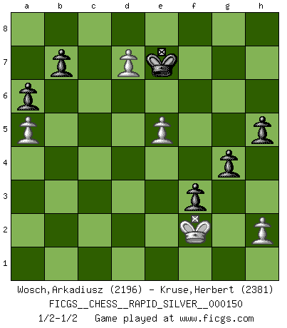 Last move : 1/2-1/2 2014 October 4 20:34:10 [Event "FICGS__CHESS__RAPID_SILVER__000150"] [Site "FICGS"] [Date "2014.07.10"] [Round "2"] [White "Wosch,Arkadiusz"] [Black "Kruse,Herbert"] [Result "1/2-1/2"] [WhiteElo "2196"] [BlackElo "2381"] 1.e4 c5 2.Nf3 d6 3.Bb5+ Nd7 4.d4 cxd4 5.Qxd4 a6 6.Bxd7+ Bxd7 7.O-O e5 8.Qd3 Rc8 9.Nc3 Qc7 10.Rd1 Be6 11.Nd2 Nf6 12.Nf1 Qc4 13.Ne3 Qxd3 14.Rxd3 g6 15.f3 Nd7 16.Ned5 f5 17.Be3 f4 18.Bf2 g5 19.a4 h5 20.Rd2 Kf7 21.Ra3 Nf6 22.Rb3 Bxd5 23.Nxd5 Nxd5 24.exd5 Rc7 25.Bb6 Rd7 26.R2d3 Be7 27.Rdc3 Bd8 28.Rc4 Kg6 29.a5 g4 30.Rbc3 Bf6 31.Rc7 Rxc7 32.Rxc7 Re8 33.Rd7 e4 34.fxe4 Rxe4 35.Rxd6 Kf5 36.Kf1 Rc4 37.c3 Ra4 38.Ke2 Ra2 39.Kd3 Rxb2 40.Bd4 Bxd4 41.cxd4 Rxg2 42.Re6 Rg1 43.Re5+ Kg6 44.d6 f3 45.Ke3 Re1+ 46.Kf2 Rxe5 47.dxe5 Kf7 48.d7 Ke7 1/2-1/2 Sicilian : Canal-Sokolsky (Nimzovich-Rossolimo, Moscow) attack Kingside Castling by player White (move 7) This chess game ended in a draw. Follow this game move after move (download)Many have become Chess Masters, no one has become the Master of Chess. (Siegbert Tarrasch) Stelle das Brett so, daß die Sonne in die Augen deines Gegners scheint. (Ruy López) Nunca antes ha habido un jugador de Ajedrez con tal conocimiento a fondo de las complejidades del juego y una inmensa voluntad absolutamente indomable de ganar. Yo pienso que Fischer es el jugador mas grande que jamás haya existido. (Lisa Lane) Les échecs c'est le défi de l'alpiniste, toujours plus haut, prêt à tout pour monter à l'assaut du Roi ennemi. Les échecs, c'est de la musique en mouvement, un ballet majestueux pour les yeux. C'est de la poésie composée par les fantômes du passé qui au même titre que Rimbaud ou Verlaine méritent notre admiration. Les échecs, c'est de la peinture ou le moindre mouvement modifie le tableau pour en faire un Picasso ou un Van Gogh. Les échecs, c'est tout et rien, c'est la vie et la mort. Jjulie33 sur le forum de France-Echecs. Internal peace cannot coexist with external war. (Don Groves)