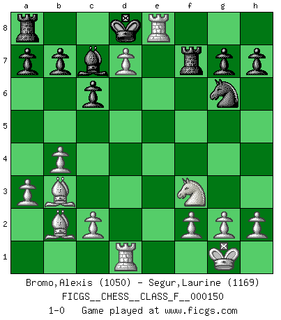 Last move : 1-0 2014 August 27 6:36:13 [Event "FICGS__CHESS__CLASS_F__000150"] [Site "FICGS"] [Date "2014.07.10"] [Round "1"] [White "Bromo,Alexis"] [Black "Segur,Laurine"] [Result "1-0"] [WhiteElo "1050"] [BlackElo "1169"] 1.d4 e6 2.a3 Nc6 3.Nf3 d5 4.Nc3 Na5 5.e3 f6 6.b4 Nc4 7.Bxc4 Bd7 8.Bb3 Ne7 9.O-O Nf5 10.Re1 Bd6 11.Nxd5 exd5 12.Bxd5 c6 13.Bb3 Rf8 14.e4 Ne7 15.e5 fxe5 16.dxe5 Bc7 17.Bb2 Ng6 18.e6 Bc8 19.Qxd8+ Kxd8 20.Rad1+ Bd7 21.exd7 Rf7 22.Re8+ 1-0 Queen's pawn Kingside Castling by player White (move 9) Player White won this chess game. Follow this game move after move (download)First-class players lose to second class players because second-class players sometimes play a first-class game. (Tarrasch) Der Schachmeister von Heute braucht Courage, einen Killerinstinkt, Ausdauer und Arroganz. (Larry Evans) Un entendimiento a fondo de las continuaciones típicas del mate, hace de las combinaciones de sacrificio mas complicadas conducirlas a ellas no solo sin dificultad, sino casi de una manera natural. (Siegbert Tarrasch) Un journaliste : 'Vous préférez avoir une dame de plus sur l'échiquier ou au lit ?' Boris Spassky : 'Ca dépend de la position.' God is an atheist. (Unknown)