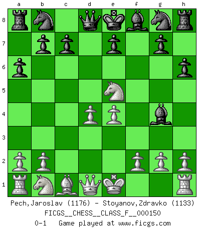 Last move : 0-1 2014 August 22 11:43:33 [Event "FICGS__CHESS__CLASS_F__000150"] [Site "FICGS"] [Date "2014.07.10"] [Round "1"] [White "Pech,Jaroslav"] [Black "Stoyanov,Zdravko"] [Result "0-1"] [WhiteElo "1176"] [BlackElo "1133"] 1.d4 d5 2.c4 dxc4 3.Nf3 h6 4.e4 Bg4 5.Bxc4 a6 6.Bxf7+ Kxf7 7.Ne5+ Ke8 0-1 This chess game has been lost on time (started : 2014.07.10 13:0:28) QGA : 3.Nf3 Player Black won this chess game. Follow this game move after move (download)Dazzling combinations are for the many, shifting wood is for the few. (Georg Kieninger) Im Blitz ist es einfacher mit einer Figur weniger anzugreifen, als sich mit einer Mehrfigur zu verteidigen. (Mikhail Nekhemyevich Tal) El Ajedrez, como cualquier otra actividad creativa, puede existir solo a través de méritos combinados de aquellos que tienen talento creativo y de aquellos que tienen la habilidad de organizar un trabajo creativo. (Mikhail Botvinnik) Horreur, mais aussi harmonie suprême : qu'y avait-il en effet au monde en dehors des échecs ? Le brouillard, l'inconnu, le non-être... (Vladimir Nabokov) War is the child of passion, passion is the child of narcissism and narcissism is the child. (...) Another game ? (Thibault de Vassal)