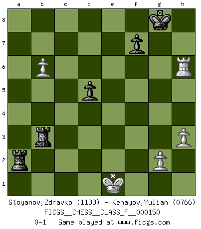 Last move : 0-1 2014 July 26 20:10:28 [Event "FICGS__CHESS__CLASS_F__000150"] [Site "FICGS"] [Date "2014.07.10"] [Round "1"] [White "Stoyanov,Zdravko"] [Black "Kehayov,Yulian"] [Result "0-1"] [WhiteElo "1133"] [BlackElo "0766"] 1.e4 e5 2.Nf3 d6 3.h3 Nf6 4.c3 Be7 5.a3 O-O 6.d3 d5 7.exd5 Nxd5 8.Nxe5 Bd6 9.Nf3 Nf6 10.Be3 Nc6 11.Be2 Be6 12.O-O Ne5 13.Bd4 Nxf3+ 14.Bxf3 c6 15.Re1 Bc7 16.Nd2 Qd6 17.Be5 Qd7 18.Bxc7 Qxc7 19.Ne4 Nxe4 20.Bxe4 h6 21.d4 b6 22.Re3 Rfe8 23.Rf3 Rad8 24.Qc1 Bd5 25.Bxd5 cxd5 26.Rg3 Re2 27.Qxh6 Qxg3 28.fxg3 gxh6 29.b4 Rde8 30.Kf1 Rc2 31.a4 Rxc3 32.a5 Rxg3 33.axb6 axb6 34.Ra6 Rd3 35.Rxb6 R8e3 36.Rxh6 Rxd4 37.b5 Rd2 38.b6 Rb3 39.Ke1 Ra2 0-1 Philidor's defense Kingside Castling by player Black (move 5) Kingside Castling by player White (move 12) 10 pieces endgame at move 36 : White KRPPP , Black KRRPP WHITE : King + 1 Rook 3 Pawns BLACK : King + 2 Rooks 2 Pawns Player Black won this chess game. Follow this game move after move (download)Play the opening like a book, the middle game like a magician, and the endgame like a machine. (Spielmann) Karpov ist ein Museumsstück. (Garry Kasparov) No hay precio que sea tan grande por la cabellera del Rey enemigo. (Koblentz) Si je n'étais pas joueur d'échecs, je serais le meilleur dans quelque chose d'autre. (Anatoli Karpov) Information on the Internet is subject to the same rules and regulations as conversation at a bar. (George Lundberg)