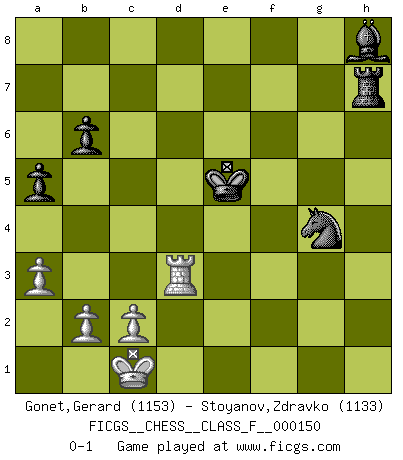 Last move : 0-1 2014 July 15 12:18:0 [Event "FICGS__CHESS__CLASS_F__000150"] [Site "FICGS"] [Date "2014.07.10"] [Round "1"] [White "Gonet,Gerard"] [Black "Stoyanov,Zdravko"] [Result "0-1"] [WhiteElo "1153"] [BlackElo "1133"] 1.d4 d5 2.e4 dxe4 3.Nc3 Nf6 4.f3 exf3 5.Qxf3 c6 6.Be3 e6 7.O-O-O Bb4 8.Nge2 h6 9.a3 Ba5 10.Ne4 Nxe4 11.Qxe4 O-O 12.Ng3 Re8 13.Bxh6 gxh6 14.Qg4+ Qg5+ 15.Qxg5+ hxg5 16.Ne4 Bd8 17.Nd6 Rf8 18.Nxc8 g4 19.Rd3 Bg5+ 20.Kb1 Rxc8 21.Rg3 f5 22.Bc4 Kf7 23.Re1 Re8 24.Rf1 Kf6 25.Rxg4 Nd7 26.h4 Bh6 27.Rg3 c5 28.h5 Nb6 29.Rg6+ Kf7 30.Bxe6+ Rxe6 31.Rxf5+ Ke7 32.Rxe6+ Kxe6 33.Rxc5 Be3 34.Rc7 Rb8 35.g4 Bxd4 36.h6 Nd7 37.Rc4 Bh8 38.Rf4 Rg8 39.Kc1 Nf6 40.Rb4 b6 41.Ra4 a5 42.Rc4 Kd5 43.Rc7 Nxg4 44.h7 Rg7 45.Rc3 Rxh7 46.Rd3+ Ke5 0-1 Blackmar gambit Queenside Castling by player White (move 7) Kingside Castling by player Black (move 11) Player Black won this chess game. Follow this game move after move (download)The game of chess is the touchstone of the intellect. (Goethe) Wenn Spassky eine Figur opfert kannst du genauso gut aufgeben. Aber wenn Tal eine Figur opfert, spiel weiter. Er könnte noch eine weitere opfern, und dann ... wer weiß? (Miguel Najdorf) Aquel que toma al Peón de Caballo de la Reina, se pasará la noche a dormir en la calle. (Anónimo) J'apprécie les joueurs d'est-indienne, c'est grâce à eux que je nourris ma famille depuis tant d'années. (Petrosian) No man has ever achieved immortality in his own life time. (Unknown)