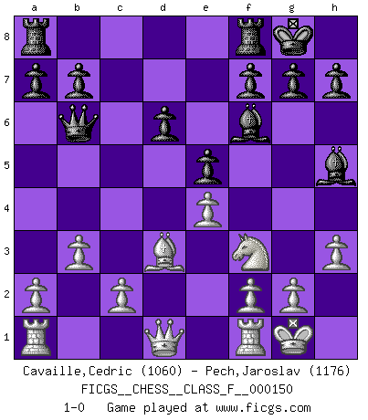 Last move : 1-0 2014 October 13 9:43:36 [Event "FICGS__CHESS__CLASS_F__000150"] [Site "FICGS"] [Date "2014.07.10"] [Round "1"] [White "Cavaille,Cedric"] [Black "Pech,Jaroslav"] [Result "1-0"] [WhiteElo "1060"] [BlackElo "1176"] 1.e4 c5 2.Nf3 d6 3.d4 cxd4 4.Nxd4 Nf6 5.Bd3 e5 6.Nf3 Bg4 7.h3 Bh5 8.Bg5 Be7 9.O-O O-O 10.Bxf6 Bxf6 11.Nc3 Nd7 12.Nd5 Nb6 13.Nxb6 Qxb6 14.b3 1-0 This chess game has been lost on time (started : 2014.07.10 13:0:28) Sicilian Kingside Castling by player White (move 9) Kingside Castling by player Black (move 9) Player White won this chess game. Follow this game move after move (download)Chess is imagination. (David Bronstein) Am wohlsten fühle ich mich, wenn ich sehe, wie sich mein Gegner im Todeskampf windet. (Robert James Fischer) Un entendimiento a fondo de las continuaciones típicas del mate, hace de las combinaciones de sacrificio mas complicadas conducirlas a ellas no solo sin dificultad, sino casi de una manera natural. (Siegbert Tarrasch) On est toujours la mazette de quelqu'un d'autre. (Anonyme) Remember : Your focus determines your reality. (Qui-Gon Jinn in Star Wars ep.1)