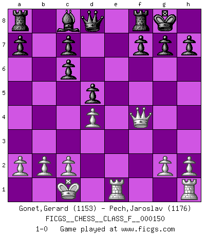 Last move : 1-0 2014 October 12 21:41:55 [Event "FICGS__CHESS__CLASS_F__000150"] [Site "FICGS"] [Date "2014.07.10"] [Round "1"] [White "Gonet,Gerard"] [Black "Pech,Jaroslav"] [Result "1-0"] [WhiteElo "1153"] [BlackElo "1176"] 1.d4 Nf6 2.f3 d5 3.e4 dxe4 4.Nc3 exf3 5.Nxf3 e6 6.Bf4 Bd6 7.Qd2 O-O 8.O-O-O Nc6 9.Ne5 Nd5 10.Nxd5 exd5 11.Bb5 Bxe5 12.Bxc6 Bxf4 13.Qxf4 bxc6 14.Rde1 1-0 This chess game has been lost on time (started : 2014.07.10 13:0:28) Comment by player 1 : Gerard Gonet : bonan ŝakludon ! Blackmar-Diemer gambit Kingside Castling by player Black (move 7) Queenside Castling by player White (move 8) Player White won this chess game. Follow this game move after move (download)I love all positions. Give me a difficult positional game, I will play it. But totally won positions, I cannot stand them. (Hein Donner) Es ist wirklich schade, dass so viele Schachspieler nicht auf ihr Äußeres achten! (Alexandra Kosteniuk) Coloca el contenido del tablero de Ajedrez en un sombrero, agita las piezas vigorosamente, derrámalas en el tablero desde una altura de medio metro y así obtienes el estilo de Wilhelm Steinitz. (H. E. Bird) Les échecs c'est le défi de l'alpiniste, toujours plus haut, prêt à tout pour monter à l'assaut du Roi ennemi. Les échecs, c'est de la musique en mouvement, un ballet majestueux pour les yeux. C'est de la poésie composée par les fantômes du passé qui au même titre que Rimbaud ou Verlaine méritent notre admiration. Les échecs, c'est de la peinture ou le moindre mouvement modifie le tableau pour en faire un Picasso ou un Van Gogh. Les échecs, c'est tout et rien, c'est la vie et la mort. Jjulie33 sur le forum de France-Echecs. Don't be irreplaceable, if you can't be replaced, you can't be promoted. (Dan Rotaru)