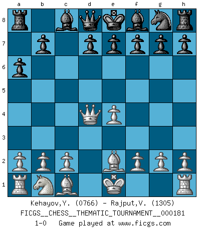 Last move : 1-0 2014 August 25 17:44:7 [Event "FICGS__CHESS__THEMATIC_TOURNAMENT__000181"] [Site "FICGS"] [Date "2014.07.11"] [Round "1"] [White "Kehayov,Yulian"] [Black "Rajput,Vishalsingh"] [Result "1-0"] [WhiteElo "0766"] [BlackElo "1305"] 1.e4 c5 2.Nf3 a6 3.Be2 Nc6 4.d4 cxd4 5.Nxd4 Nxd4 6.Qxd4 1-0 This chess game has been lost on time (started : 2014.07.11 1:56:6) Sicilian : O'Kelly variation Player White won this chess game. Follow this game move after move (download)The winner of the game is the player who makes the next-to-last mistake. (Savielly Tartakover) Wenn du gegen Bobby spielst, ist es keine Frage von gewinnen oder verlieren. Es ist eine Frage des Überlebens. (Boris Vassilievich Spassky) Vive, pierde y aprende al observar a tu oponente como ganar. (Amber Steenbock) Même un GMI sait rarement calculer sur plus de cinq coups une attaque à sacrifices. (Rudolf Spielmann) Train yourself to let go of everything you fear to lose. (Master Yoda in Star Wars ep.3)