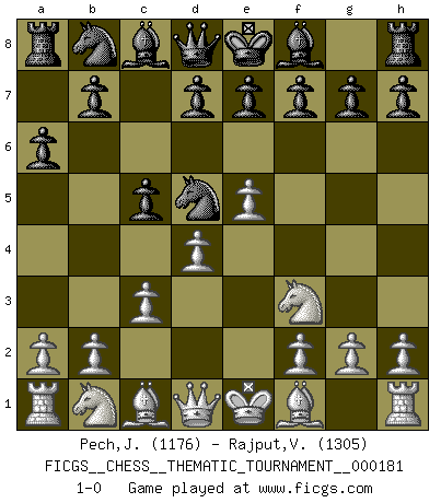 Last move : 1-0 2014 September 19 20:9:28 [Event "FICGS__CHESS__THEMATIC_TOURNAMENT__000181"] [Site "FICGS"] [Date "2014.07.11"] [Round "1"] [White "Pech,Jaroslav"] [Black "Rajput,Vishalsingh"] [Result "1-0"] [WhiteElo "1176"] [BlackElo "1305"] 1.e4 c5 2.Nf3 a6 3.c3 Nf6 4.e5 Nd5 5.d4 1-0 This chess game has been lost on time (started : 2014.07.11 1:56:6) Sicilian : O'Kelly variation Player White won this chess game. Follow this game move after move (download)A sacrifice is best refuted by accepting it. (Wilhelm Steinitz) Über die Verhaftung Bobby Fischers: Warum es die Bush-Administration für nötig befindet einen 61 Jahre alten Mann zu hetzten, der für niemanden ausser sich selbste eine Gefahr darstellt ist ein Rätsel. (Nigel Short) No hay precio que no valga la pena por la cabellera del Rey enemigo. (Koblentz) Même si l'adversaire joue le coup analysé précédemment, recommencez l'analyse en voyant la nouvelle position. Première règle de Blumenfeld You must have a dream in order to have it come true. (A.P.J. Kalam)
