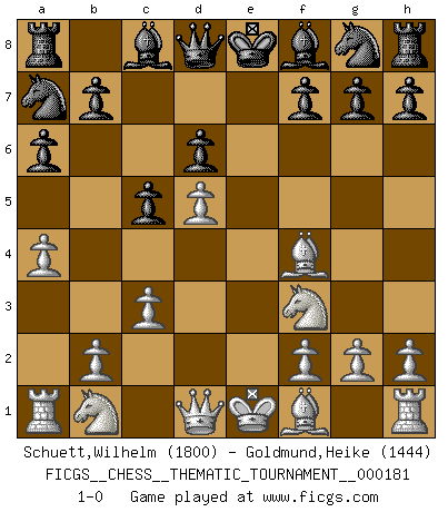 Last move : 1-0 2014 September 22 20:9:49 [Event "FICGS__CHESS__THEMATIC_TOURNAMENT__000181"] [Site "FICGS"] [Date "2014.07.11"] [Round "1"] [White "Schuett,Wilhelm"] [Black "Goldmund,Heike"] [Result "1-0"] [WhiteElo "1800"] [BlackElo "1444"] 1.e4 c5 2.Nf3 a6 3.c3 Nc6 4.d4 e6 5.d5 exd5 6.exd5 Na7 7.Bf4 d6 8.a4 1-0 This chess game has been lost on time (started : 2014.07.11 1:56:6) Sicilian : O'Kelly variation Player White won this chess game. Follow this game move after move (download)A good sacrifice is one that is not necessarily sound but leaves your opponent dazed and confused. (Rudolph Spielmann) Bis jetzt ist Weiß einer wohlbekannten Analyse gefolgt. Aber jetzt begeht er einen schrecklichen Fehler: Er beginnt seinen eigenen Kopf zu benutzen. (Siegbert Tarrasch) Ser exitoso en el Ajedrez te permite descubrir tu propia personalidad. Eso es lo que deseo para los niños de mi clase. (Saudin Robovic) J'apprécie les joueurs d'est-indienne, c'est grâce à eux que je nourris ma famille depuis tant d'années. (Petrosian) Hold em is to stud what chess is to checkers. (Johnny Moss)