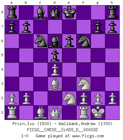 Last move : 1-0 2007 May 14 15:10:6 [Event "FICGS__CHESS__CLASS_D__000032"] [Site "FICGS"] [Date "2007.02.19"] [Round "1"] [White "Prcin,Ivo"] [Black "Wallbank,Andrew"] [Result "1-0"] [WhiteElo "1500"] [BlackElo "1700"] 1.e4 e6 2.d4 d5 3.Nd2 Nf6 4.e5 Nfd7 5.Bd3 c5 6.c3 Nc6 7.Ne2 cxd4 8.cxd4 f6 9.exf6 Nxf6 10.Nf3 Bd6 11.O-O 1-0 This chess game has been lost on time (started : 2007.02.19 16:10:30) French : Tarrasch, Closed variation Kingside Castling by player White (move 11) Player White won this chess game. Follow this game move after move (download)Chess problems demand from the composer the same virtues that characterize all worthwhile art: originality, invention, conciseness, harmony, complexity, and splendid insincerity. (Vladimir Nabokov) Fallen sollten polizeilich verboten werden. (Savielly Grigorievitsch Tartakower) En partidas rápidas, el Caballo es mas poderoso que el Alfil. (Vlastimil Hort) Le thème de l'attaque double intervient d'une manière ou d'une autre dans l'immense majorité des combinaisons. (Youri Averbakh) When you stop learning you start dying. (M. Scott Adams)