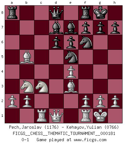 Last move : 0-1 2014 October 8 9:30:43 [Event "FICGS__CHESS__THEMATIC_TOURNAMENT__000181"] [Site "FICGS"] [Date "2014.07.11"] [Round "1"] [White "Pech,Jaroslav"] [Black "Kehayov,Yulian"] [Result "0-1"] [WhiteElo "1176"] [BlackElo "0766"] 1.e4 c5 2.Nf3 a6 3.c4 e6 4.Nc3 d6 5.d4 cxd4 6.Nxd4 Nf6 7.Be2 Be7 8.O-O O-O 9.Be3 Bd7 10.Rc1 Nc6 11.Nb3 b5 12.cxb5 axb5 13.Bxb5 Ne5 0-1 This chess game has been lost on time (started : 2014.07.11 1:56:6) Sicilian : O'Kelly variation Kingside Castling by player White (move 8) Kingside Castling by player Black (move 8) Player Black won this chess game. Follow this game move after move (download)Chess books should be used as we use glasses: to assist the sight, although some players make use of them as if they thought they conferred sight. (Jose Raul Capablanca) Schach ist wie eine schöne Frau, zu der wir ständig zurückkehren, gleichviel, wie oft sie uns zurückweist. (Anonymous) Un juego de Ajedrez es un dialogo, una conversación entre un jugador y su oponente. Cada movimiento del oponente puede contener amenazas o tropiezos, pero un jugador no se puede defender de las amenazas o tomar ventaja de los tropiezos si es que no se pregunta a sí mismo: ¿Que es lo que mi oponente va a hacer después de cada movida?. (Bruce A. Moon) C'est la seule position que je connaisse où les deux camps sont mals. Propos prêtés à V. Anand. A clear conscience is usually the sign of a bad memory. (Unknown)