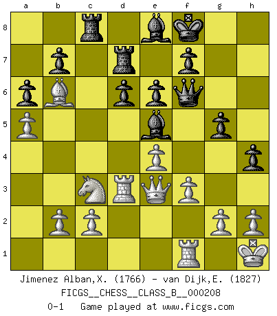 Last move : 0-1 2014 December 26 3:17:17 [Event "FICGS__CHESS__CLASS_B__000208"] [Site "FICGS"] [Date "2014.07.11"] [Round "1"] [White "Jimenez Alban,Xavier Miguel"] [Black "van Dijk,Erik L."] [Result "0-1"] [WhiteElo "1766"] [BlackElo "1827"] 1.e4 c5 2.Nf3 d6 3.d4 Nf6 4.Nc3 cxd4 5.Nxd4 a6 6.Be3 Ng4 7.Bg5 h6 8.Bh4 g5 9.Bg3 Bg7 10.Be2 h5 11.Bxg4 Bxg4 12.f3 Bd7 13.Bf2 Nc6 14.O-O e6 15.Nxc6 Bxc6 16.Qd3 Be5 17.a4 Qf6 18.Rad1 Rc8 19.a5 O-O 20.Bd4 Rfd8 21.Qe3 Kf8 22.Rd3 Be8 23.Bb6 Rd7 24.Kh1 h4 0-1 This chess game has been lost on time (started : 2014.07.11 16:40:25) Sicilian Kingside Castling by player White (move 14) Kingside Castling by player Black (move 19) Player Black won this chess game. Follow this game move after move (download)Chess is a foolish expedient for making idle people believe they are doing something very clever when they are only wasting their time. (George Bernard Shaw) Im Blitz ist es einfacher mit einer Figur weniger anzugreifen, als sich mit einer Mehrfigur zu verteidigen. (Mikhail Nekhemyevich Tal) Si pudieramos observar el interior de la cabeza de un jugador de Ajedrez, encontraríamos ahí un mundo lleno de sentimientos, imágenes, ideas, emoción y pasión. (Alfred Binet) Le pion, dans sa simplicité, marche droit devant lui, mais lorsqu'il prend, il le fait obliquement? Ainsi l'homme, tant qu'il reste pauvre, marche dans la droiture et vit honnêtement, mais lorsqu'il recherche les honneurs, il flatte, se parjure et, par les voies obliques, cherche une position supérieure sur l'échiquier du monde. (Jean de Galles) Wisdom is the reward you get for a lifetime of listening when you'd have preferred to talk. (Doug Larson)
