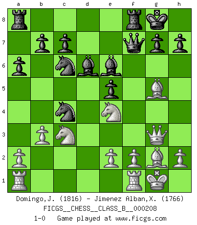 Last move : 1-0 2014 November 4 15:33:16 [Event "FICGS__CHESS__CLASS_B__000208"] [Site "FICGS"] [Date "2014.07.11"] [Round "1"] [White "Domingo,Jordi"] [Black "Jimenez Alban,Xavier Miguel"] [Result "1-0"] [WhiteElo "1816"] [BlackElo "1766"] 1.g4 d5 2.Bg2 e5 3.c4 dxc4 4.Nc3 Nf6 5.g5 Nfd7 6.Nf3 Nc6 7.d4 cxd3 8.Qxd3 Bd6 9.Be3 Nb6 10.Nd2 Nb4 11.Qe4 O-O 12.O-O f5 13.gxf6 Qxf6 14.Nb5 Nc6 15.Qf3 Qe7 16.Qg3 Be6 17.Ne4 Nc4 18.Bg5 Qf7 19.b3 a6 20.Nbc3 1-0 Grob's attack Kingside Castling by player Black (move 11) Kingside Castling by player White (move 12) Player White won this chess game. Follow this game move after move (download)I guess a certain amount of temperament is expected of Chess geniuses. (Ron Gross) Schach verlangt totale Konzentration. (Robert James Fischer) En un gambito tu regalas un Peón por el bién de tomar un juego perdido. (Samuel Standige Boden) La vérité est comme le meilleur coup aux échecs : elle existe, mais il faut la chercher. (Arturo Perez-Reverte) The good fighters of old first put themselves beyond the possibility of defeat, and then waited for an opportunity of defeating the enemy. (Sun Tzu)