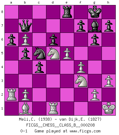 Last move : 0-1 2014 September 27 18:11:50 [Event "FICGS__CHESS__CLASS_B__000208"] [Site "FICGS"] [Date "2014.07.11"] [Round "1"] [White "Meli,Cosimo Leonardo"] [Black "van Dijk,Erik L."] [Result "0-1"] [WhiteElo "1938"] [BlackElo "1827"] 1.d4 Nf6 2.c4 c5 3.d5 d6 4.Nc3 g6 5.e4 Bg7 6.Bd3 O-O 7.h3 a6 8.a4 e6 9.Nf3 exd5 10.cxd5 Re8 11.O-O Nbd7 12.Bf4 c4 13.Bc2 Qb6 14.Ra2 Qc7 15.Qe2 Rb8 16.a5 b5 17.Nd2 Bb7 18.Be3 Rbc8 19.Bb1 Nc5 20.Rc1 Nfd7 21.Rd1 Ne5 22.Bd4 Qd8 23.Qe3 Nb3 24.Ba7 Qe7 25.Bb6 Qh4 26.f4 Nd7 27.Nf3 Qe7 28.Re1 Nxb6 29.Qxb6 Nc5 30.e5 Qd7 31.Kh1 Bxd5 32.Nxd5 Rc6 33.Rd1 Rxb6 34.axb6 Qb7 0-1 Benoni defense, Hromodka system Kingside Castling by player Black (move 6) Kingside Castling by player White (move 11) Player Black won this chess game. Follow this game move after move (download)A win by an unsound combination, however showy, fills me with artistic horror. (Wilhelm Steinitz) Es macht mich traurig, wenn ich sehe, dass Golfprofis mehr verdienen als Schachsportler. Obwohl ich davon überzeugt bin, dass wir Schachspieler viel härter trainieren müssen als die Golfer. (Alexandra Kosteniuk) El Ajedrez es tan inspirador que yo no creo que un buen jugador sea capaz de tener un pensamiento malo durante una partida. (Wilhelm Steinitz) A ce moment-là, je menaçais de comprendre la position ! (Clément L'Heureux) The only difference between a tax man and a taxidermist is that the taxidermist leaves the skin. (Mark Twain)