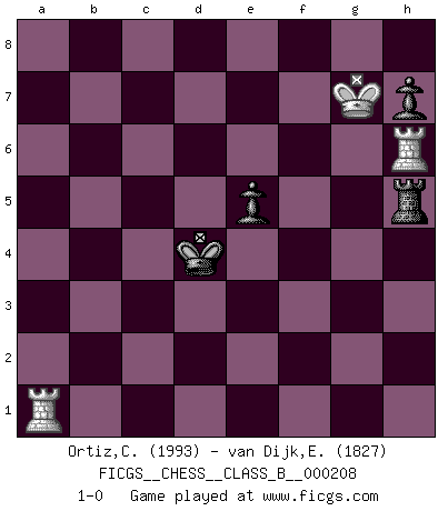 Last move : 1-0 2015 February 13 23:31:41 [Event "FICGS__CHESS__CLASS_B__000208"] [Site "FICGS"] [Date "2014.07.11"] [Round "1"] [White "Ortiz,Clodomiro"] [Black "van Dijk,Erik L."] [Result "1-0"] [WhiteElo "1993"] [BlackElo "1827"] 1.d4 c5 2.d5 Nf6 3.Nf3 b5 4.c4 Bb7 5.Bf4 d6 6.a3 bxc4 7.e4 Nxe4 8.Bxc4 g5 9.Nxg5 Nxg5 10.Bxg5 Rg8 11.Bf4 Qb6 12.Nc3 Nd7 13.O-O Bg7 14.Rb1 Ba6 15.Bxa6 Qxa6 16.Ne4 Be5 17.Bxe5 Nxe5 18.f4 Ng4 19.Qf3 Qc4 20.b4 Rg6 21.h3 Qd4+ 22.Kh1 Ne3 23.Rf2 Nf5 24.Re1 cxb4 25.g4 Nh4 26.Qg3 f5 27.Rd2 Qc4 28.Ng5 Rh6 29.Qe3 Ng6 30.gxf5 Qxf4 31.fxg6 Qxe3 32.Rxe3 Rxg6 33.Ne6 Rb8 34.axb4 Rxb4 35.Ra3 Rb1+ 36.Kh2 R6g1 37.Rxa7 Rh1+ 38.Kg3 Rhf1 39.Ng5 Rb3+ 40.Kh4 Rb4+ 41.Kh5 R1f4 42.Ra8+ Kd7 43.Ne6 Rf5+ 44.Kh6 Rh4+ 45.Kg7 Rxd5 46.Rxd5 Kxe6 47.Rd3 Kf5 48.Ra5+ e5 49.Rxd6 Rxh3 50.Rf6+ Ke4 51.Re6 Rh5 52.Ra1 Kd4 53.Rh6 1-0 Old Benoni defense Kingside Castling by player White (move 13) 10 pieces endgame at move 46 : White KRRNP , Black KRPPP WHITE : King + 2 Rooks 1 Knight 1 Pawn BLACK : King + 1 Rook 3 Pawns 9 pieces endgame at move 46 : White KRRP , Black KRPPP WHITE : King + 2 Rooks 1 Pawn BLACK : King + 1 Rook 3 Pawns 8 pieces endgame at move 49 : White KRRP , Black KRPP WHITE : King + 2 Rooks 1 Pawn BLACK : King + 1 Rook 2 Pawns 7 pieces endgame at move 49 : White KRR , Black KRPP WHITE : King + 2 Rooks BLACK : King + 1 Rook 2 Pawns Player White won this chess game. Follow this game move after move (download)The hardest game to win is a won game. (Emanuel Lasker) Karpov ist ein Museumsstück. (Garry Kasparov) El tablero es el mundo, las piezas es el fenomeno del universo, las reglas del juego son lo que llamamos leyes de la naturaleza y el jugador del lado opuesto, se encuentra oculto a nuestra vista. (Thomas Huxley) Echiquier : carré parfait, comme la Jérusalem nouvelle décrite par l'auteur de l'Apocalypse, huit cases sur huit, exaltation du chiffre 4, symbole du cosmos aux quatre horizons... où le noir et le blanc, l'ombre et la lumière, le mal et le bien s'entremêlent et se conjuguent. (Robert Couffignal, Le Gambit du poète) If things go wrong, don't go with them. (Roger Babson)