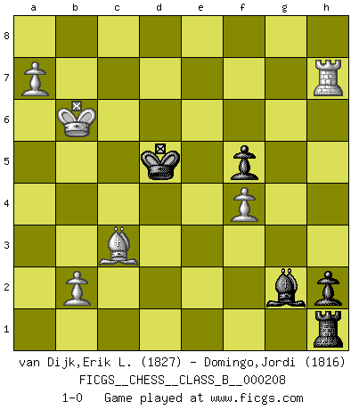 Last move : 1-0 2015 July 20 6:18:51 [Event "FICGS__CHESS__CLASS_B__000208"] [Site "FICGS"] [Date "2014.07.11"] [Round "1"] [White "van Dijk,Erik L."] [Black "Domingo,Jordi"] [Result "1-0"] [WhiteElo "1827"] [BlackElo "1816"] 1.e4 e5 2.Nf3 d6 3.d4 exd4 4.Nxd4 g6 5.Nc3 Bg7 6.Be3 Nf6 7.Qd2 O-O 8.O-O-O Re8 9.f3 Nc6 10.g4 Ne5 11.g5 Nh5 12.f4 Nc6 13.Nxc6 bxc6 14.Be2 c5 15.Bxh5 gxh5 16.Bxc5 Bxc3 17.Qxc3 Rxe4 18.Bd4 Bg4 19.Bg7 d5 20.Bh8 d4 21.Rxd4 Rxd4 22.Qxd4 Qxd4 23.Bxd4 Re8 24.Be5 h6 25.h3 Bf5 26.h4 c6 27.Rg1 Kh7 28.Rg3 Bg4 29.gxh6 Kxh6 30.Ra3 Re7 31.Ra6 Bf3 32.Bd4 Kg6 33.Ra5 Re1+ 34.Kd2 Re2+ 35.Kd3 f5 36.Rxa7 Rh2 37.a4 Rxh4 38.a5 c5 39.Ra6+ Kh7 40.Bxc5 Be4+ 41.Kc4 Rh2 42.Be7 Rxc2+ 43.Kb3 Rc1 44.Bg5 Kg7 45.Rh6 Ra1 46.Kb4 Rb1 47.Kc3 Rc1+ 48.Kd4 Rb1 49.Rb6 Rh1 50.Bf6+ Kf7 51.Kc5 h4 52.Bc3 h3 53.Rh6 h2 54.Rh3 Ke7 55.Kb6 Bg2 56.Rh7+ Ke6 57.a6 Kd5 58.a7 1-0 This chess game has been lost on time (started : 2014.07.11 16:40:25) Philidor : Larsen variation Kingside Castling by player Black (move 7) Queenside Castling by player White (move 8) Player White won this chess game. Follow this game move after move (download)For me, Chess is life and every game is like a new life. Every Chess player gets to live many lives in one lifetime. (Eduard Gufeld) Ich verstehe Aljechins Kombinationen ganz gut; aber woher er diese Angriffschancen bekommt und wie er die Eröffnung behandelt das ist für mich ein Buch mit sieben Siegeln. (Rudolf Spielmann) No hay otro maestro que tenga una voluntad terrífica de ganar. Al tablero, el irradía peligro y aún los oponentes mas fuertes tienden a congelarse como liebres cuando olfatean a una pantera. Aún sus debilidades son peligrosas. Con las blancas, su juego de apertura es predecible - te es posible hacer planes en su contra - pero es tan fuerte que tus planes casi nunca funcionan. En el juego medio, su precisión e invención son fabulosas y en finales, tú simplemente no le puedes vencer. (Experto Alemán anónimo) Il n'y a pas eu de défaite parce que je ne crois pas que cet ordinateur ait jamais existé. IBM a triché en refusant d'imprimer les modes de recherche de la machine. C'est évident, pendant le match, des coups décisifs ont été joués par des êtres humains. Aujourd'hui, les meilleurs spécialistes en informatique ne peuvent toujours pas expliquer comment Deep-Blue a pu jouer contre la logique des ordinateurs. IBM a gagné une guerre de communication, mais ils sont incapables de prouver que l'ordinateur a gagné tout seul. (Garry Kasparov) At work, the authority of a person is inversely proportional to the number of pens that person is carrying. (Dan Rotaru)