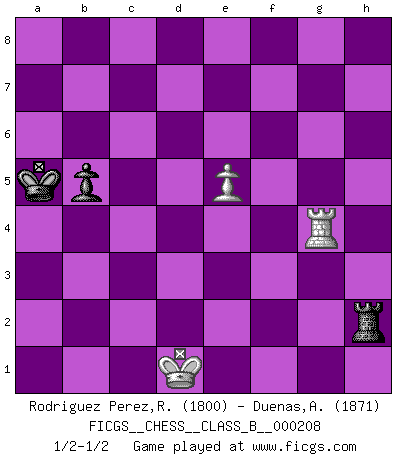 Last move : 1/2-1/2 2014 July 16 19:6:49 [Event "FICGS__CHESS__CLASS_B__000208"] [Site "FICGS"] [Date "2014.07.11"] [Round "1"] [White "Rodriguez Perez,Rene"] [Black "Duenas,Alexis"] [Result "1/2-1/2"] [WhiteElo "1800"] [BlackElo "1871"] 1.e4 e5 2.Nf3 Nc6 3.Bb5 a6 4.Bxc6 dxc6 5.O-O f6 6.d4 exd4 7.Nxd4 c5 8.Nb3 Qxd1 9.Rxd1 Bg4 10.f3 Be6 11.Be3 b6 12.a4 Kf7 13.Nc3 Bd6 14.a5 c4 15.Nd4 b5 16.b3 cxb3 17.cxb3 Ne7 18.Nce2 Rhd8 19.Rac1 Rac8 20.Nxe6 Kxe6 21.Kf1 c5 22.Bxc5 Bxc5 23.Rxd8 Rxd8 24.Rxc5 Rd1+ 25.Kf2 Kd6 26.Rc2 Rd3 27.Rb2 g5 28.b4 Nc6 29.Ng3 Nd4 30.Nf5+ Ke5 31.Ne3 Nc6 32.Ke2 Ra3 33.Nc2 Nd4+ 34.Kd2 Nxc2 35.Rxc2 Kd4 36.Rc6 Ra2+ 37.Kd1 Rxg2 38.Rxa6 Rxh2 39.Rxf6 h5 40.Rd6+ Kc4 41.e5 g4 42.fxg4 hxg4 43.Rg6 Kxb4 44.Rxg4+ Kxa5 1/2-1/2 Ruy Lopez : Exchange, Gligoric variation Kingside Castling by player White (move 5) 10 pieces endgame at move 42 : White KRPPPP , Black KRPP WHITE : King + 1 Rook 4 Pawns BLACK : King + 1 Rook 2 Pawns 9 pieces endgame at move 42 : White KRPPP , Black KRPP WHITE : King + 1 Rook 3 Pawns BLACK : King + 1 Rook 2 Pawns 8 pieces endgame at move 43 : White KRPP , Black KRPP WHITE : King + 1 Rook 2 Pawns BLACK : King + 1 Rook 2 Pawns 7 pieces endgame at move 44 : White KRPP , Black KRP WHITE : King + 1 Rook 2 Pawns BLACK : King + 1 Rook 1 Pawn 6 pieces endgame at move 44 : White KRP , Black KRP WHITE : King + 1 Rook 1 Pawn BLACK : King + 1 Rook 1 Pawn This chess game ended in a draw. Follow this game move after move (download)Fischer Chess play was always razor-sharp, rational and brilliant. One of the best ever. (Dave Regis) Mit Schach schule ich mein Gefühl für Geometrie, was für Tennis und Schach gleichermaßen wichtig ist. (Boris Becker) Un mal plan es mejor que no tener ningún plan. (Frank Marshall) Les échecs sont utiles à l'exercice de la faculté de penser et à celle de l'imagination. Car nous devons posséder une méthode élaborée pour atteindre des buts partout où nous devons conduire notre raison. (Leibnitz) There is a very easy way to return from a casino with a small fortune : go there with a large one. (Jack Yelton)