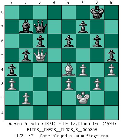 Last move : 1/2-1/2 2014 July 19 16:21:29 [Event "FICGS__CHESS__CLASS_B__000208"] [Site "FICGS"] [Date "2014.07.11"] [Round "1"] [White "Duenas,Alexis"] [Black "Ortiz,Clodomiro"] [Result "1/2-1/2"] [WhiteElo "1871"] [BlackElo "1993"] 1.d4 Nf6 2.c4 e6 3.Nc3 d5 4.Bg5 c6 5.e3 Be7 6.Nf3 O-O 7.Rc1 h6 8.Bh4 Nbd7 9.Bd3 dxc4 10.Bxc4 b5 11.Bd3 Bb7 12.O-O a6 13.Bxf6 Nxf6 14.Ne4 Nd7 15.a3 a5 16.Nfd2 a4 17.Qc2 Qb6 18.Nc5 Nxc5 19.dxc5 Qc7 20.Rfd1 Rfd8 21.Ne4 Rd5 22.Nd6 Bxd6 23.cxd6 Qxd6 24.Bh7+ Kh8 25.Be4 Rxd1+ 26.Rxd1 Qe7 27.Qc3 Rc8 28.Bc2 Rd8 29.Rxd8+ Qxd8 30.Qc5 Kg8 31.g3 g6 32.Be4 Qd7 33.h4 h5 34.Kf1 Qc7 35.Ke2 Kg7 36.f4 Kg8 37.Kf2 Qd7 38.Ke2 Qc7 39.Kf2 Kg7 40.Qd4+ Kh7 41.Qc5 Kg8 1/2-1/2 Queen's pawn game Kingside Castling by player Black (move 6) Kingside Castling by player White (move 12) This chess game ended in a draw. Follow this game move after move (download)It is not a move, even the best move that you must seek, but a realizable plan. (Eugene Znosko-Borovsky) Schach ist ein Kampf gegen den Fehler. (Johannes Herrman Zukertort) Tu no necesitas jugar muy bien, únicamente ayudar a tu oponenet a que juegue muy mal. (Genrikh Chepukaitis) On est toujours la mazette de quelqu'un d'autre. (Anonyme) Logic : The art of thinking and reasoning in strict accordance with the limitations and incapacities of the human misunderstanding. (Ambrose Bierce)