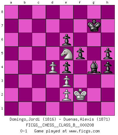 Last move : 0-1 2015 February 10 12:21:6 [Event "FICGS__CHESS__CLASS_B__000208"] [Site "FICGS"] [Date "2014.07.11"] [Round "1"] [White "Domingo,Jordi"] [Black "Duenas,Alexis"] [Result "0-1"] [WhiteElo "1816"] [BlackElo "1871"] 1.g4 d5 2.Bg2 Bxg4 3.c4 c6 4.cxd5 cxd5 5.Nc3 Nf6 6.Qb3 e6 7.Qxb7 Nbd7 8.Nb5 Rc8 9.h3 Bh5 10.Qxa7 Bc5 11.Qa4 O-O 12.d4 Be7 13.Qb3 Ne4 14.Bxe4 dxe4 15.Bd2 Nb6 16.Rc1 Rxc1+ 17.Bxc1 Qa8 18.Kf1 Nd5 19.Rh2 Bb4 20.a3 Rc8 21.Be3 Qb8 22.Rg2 Qxb5 23.axb4 Ra8 24.Qd1 Qxb4 25.Qc1 Nxe3+ 26.fxe3 h6 27.h4 Ra2 28.Qe1 Qxb2 29.Qg3 Bg6 30.Nh3 Qc1+ 31.Kf2 Qd1 32.Nf4 Ra1 33.Rg1 Qxg1+ 34.Qxg1 Rxg1 35.Kxg1 Bf5 36.Kf2 Bg4 37.Kg3 h5 38.Kf2 g6 39.Ng2 f6 40.Ne1 g5 41.Nc2 Kf7 42.Nb4 gxh4 43.Nc6 f5 44.Ne5+ Kg7 0-1 Comment by player 2 : Alexis Duenas : este compadre no se da cuenta que el antichess no funciona con las computadoras Grob : Fritz gambit Kingside Castling by player Black (move 11) Player Black won this chess game. Follow this game move after move (download)Mistrust is the most necessary characteristic of the Chess player. (Siegbert Tarrasch) Im Spitzenschach von heute geht es nur um Vorbereitung, um tiefgründige, sorgfältige Eröffnungsvorbereitung. (Nigel Short) La mitad de las variaciones que son calculadas en una partida de torneo, resultan ser completamente superfluas. Desafortunadamente, nadie sabe por adelantado cual mitad. (Jan Tinman) La tactique est l'élément le plus important du milieu de jeu. (Siegbert Tarrasch) A bird doesn't sing because it has an answer, it sings because it has a song. (Maya Angelou)