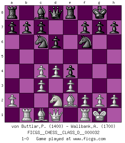 Last move : 1-0 2007 April 6 10:7:6 [Event "FICGS__CHESS__CLASS_D__000032"] [Site "FICGS"] [Date "2007.02.19"] [Round "1"] [White "von Buttlar,Paul"] [Black "Wallbank,Andrew"] [Result "1-0"] [WhiteElo "1400"] [BlackElo "1700"] 1.c4 e5 2.Nc3 Nf6 3.Nf3 Nc6 4.d4 e4 5.Nd2 Bb4 6.e3 O-O 7.Be2 Re8 8.O-O Bxc3 9.bxc3 d6 10.Rb1 1-0 This chess game has been lost on time (started : 2007.02.19 16:10:30) English Opening Kingside Castling by player Black (move 6) Kingside Castling by player White (move 8) Player White won this chess game. Follow this game move after move (download)The most important feature of the Chess position is the activity of the pieces. This is absolutely fundamental in all phases of the game: Opening, Middlegame and especially Endgame. The primary constraint on a piece's activity is the Pawn structure. (Michael Stean) Pläne sind die Träume des Verständigen. (Ernst Freiherr von Feuchtersleben) Todavía soy una víctima del Ajedrez. Tiene toda la belleza del arte y mucho mas. No puede ser comercializado. El Ajedrez es mas puro que el arte en su posición social. (Marcel Duchamp) Ce qui est bien, c'est d'avoir tout un tas de pièces en prise : l'adversaire ne peut en prendre qu'une à la fois. Cité par Thierry Audin. Don't be irreplaceable, if you can't be replaced, you can't be promoted. (Dan Rotaru)