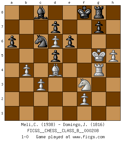 Last move : 1-0 2015 January 30 16:5:54 [Event "FICGS__CHESS__CLASS_B__000208"] [Site "FICGS"] [Date "2014.07.11"] [Round "1"] [White "Meli,Cosimo Leonardo"] [Black "Domingo,Jordi"] [Result "1-0"] [WhiteElo "1938"] [BlackElo "1816"] 1.d4 b5 2.e4 a6 3.Nf3 Bb7 4.Bd3 e6 5.O-O c5 6.c3 Nf6 7.Re1 h6 8.Nbd2 Qc7 9.e5 Nd5 10.dxc5 Bxc5 11.a4 Nc6 12.Ne4 Be7 13.Nd6+ Bxd6 14.exd6 Qb8 15.Be4 O-O 16.Bxd5 exd5 17.Bf4 Re8 18.Qd3 bxa4 19.Qf5 Re6 20.Rxe6 fxe6 21.Qg4 Kh7 22.Rxa4 Qe8 23.Be5 Qg6 24.Qxg6+ Kxg6 25.Rg4+ Kf5 26.Rf4+ Kg6 27.b4 Rg8 28.Bd4 Bc8 29.h3 h5 30.g4 hxg4 31.Rxg4+ Kf7 32.Kg2 Bb7 33.Kg3 Bc8 34.h4 Kf8 35.h5 Kf7 36.Kh4 Kf8 37.Kg5 1-0 Polish defense Kingside Castling by player White (move 5) Kingside Castling by player Black (move 15) Player White won this chess game. Follow this game move after move (download)The most important feature of the Chess position is the activity of the pieces. This is absolutely fundamental in all phases of the game: Opening, Middlegame and especially Endgame. The primary constraint on a piece's activity is the Pawn structure. (Michael Stean) Die Idee von Capablanca, Schach als Fach in den Schulen zu lehren, ist großartig. (Fidel Castro) Yo creo que el Ajedrez posee una magia que es también una ayuda en la edad avanzada. Una rodilla reumática es olvidada durante una partida de Ajedrez y otros eventos pueden parecer algo sin importancia comparada a una catástrofe en el tablero de Ajedrez. (Vlastimil Hort) Ce qui est bien, c'est d'avoir tout un tas de pièces en prise : l'adversaire ne peut en prendre qu'une à la fois. Cité par Thierry Audin. They misunderestimated me. (George W. Bush, Bentonville nov. 6, 2000)