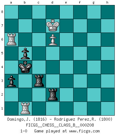 Last move : 1-0 2015 October 12 13:14:38 [Event "FICGS__CHESS__CLASS_B__000208"] [Site "FICGS"] [Date "2014.07.11"] [Round "1"] [White "Domingo,Jordi"] [Black "Rodriguez Perez,Rene"] [Result "1-0"] [WhiteElo "1816"] [BlackElo "1800"] 1.g4 d5 2.h3 e5 3.Bg2 Nc6 4.c4 Nge7 5.cxd5 Nxd5 6.Nc3 Be6 7.d3 Qd7 8.Nf3 f6 9.Bd2 O-O-O 10.Rc1 Kb8 11.a3 Nxc3 12.Bxc3 Bd5 13.Qa4 a6 14.Rg1 h5 15.g5 Be7 16.Qh4 Qe6 17.Kf1 e4 18.dxe4 Bxe4 19.gxf6 Bxf6 20.Ng5 Bxg2+ 21.Rxg2 Qd5 22.Rg3 Ne7 23.Rg1 Qc6 24.Qe4 Nd5 25.Bd2 Qb5 26.b4 Rhe8 27.Qf3 b6 28.Ne4 Be5 29.Bg5 Rf8 30.Qd3 Qxd3 31.exd3 Rde8 32.Rd1 Rf3 33.Kg2 Ref8 34.d4 Bd6 35.Rde1 Rxa3 36.Nxd6 cxd6 37.Be7 Nxe7 38.Rxe7 Raf3 39.Rxg7 Rxf2+ 40.Kg3 R8f7 41.Rg8+ Kb7 42.Kh4 R2f5 43.R1g5 Rf4+ 44.Kxh5 Rh7+ 45.Kg6 Rxh3 46.d5 Rc3 47.Rd8 Rxb4 48.Rxd6 a5 49.Kf5 a4 50.Rg7+ Ka6 51.Rd8 Rd3 52.d6 Rbd4 53.Ke5 Kb5 54.Rg1 a3 55.Ra1 Ra4 56.Rc8 Rd2 57.Rb1+ Rb4 58.Ra1 Rb3 59.Ra8 Kb4 60.Ke6 Re3+ 61.Kd7 b5 62.Ra6 Rc3 63.Rb1+ 1-0 Grob's attack Queenside Castling by player Black (move 9) 10 pieces endgame at move 47 : White KRRP , Black KRRPPP WHITE : King + 2 Rooks 1 Pawn BLACK : King + 2 Rooks 3 Pawns 9 pieces endgame at move 48 : White KRRP , Black KRRPP WHITE : King + 2 Rooks 1 Pawn BLACK : King + 2 Rooks 2 Pawns Player White won this chess game. Follow this game move after move (download)Chess demands total concentration. (Bobby Fischer) Als ich elf wurde, wurde ich einfach gut. (Robert James Fischer) No todos los artistas son jugadores de Ajedrez, pero todos los jugadores de Ajedrez son artistas. (Marcel Duchamp) La tactique, c'est ce que vous faites quand il y a quelque chose à faire; la stratégie, c'est ce que vous faites quand il n'y a rien à faire. (Savielli Tartacower) Chess is everything: art, science and sport. (Anatoly Karpov)
