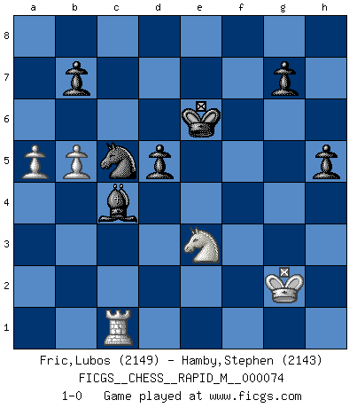Last move : 1-0 2014 December 29 0:10:12 [Event "FICGS__CHESS__RAPID_M__000074"] [Site "FICGS"] [Date "2014.07.15"] [Round "1"] [White "Fric,Lubos"] [Black "Hamby,Stephen"] [Result "1-0"] [WhiteElo "2149"] [BlackElo "2143"] 1.Nf3 d5 2.g3 c6 3.Bg2 Nf6 4.O-O Bg4 5.d4 Nbd7 6.Nbd2 e6 7.Re1 Be7 8.e4 O-O 9.c3 h6 10.e5 Nh7 11.h3 Bf5 12.h4 Rc8 13.Nf1 Be4 14.Qb3 Qb6 15.Qxb6 axb6 16.N3d2 Bd3 17.Re3 Bg6 18.f4 Ra8 19.Nf3 b5 20.g4 Nb6 21.h5 Bc2 22.Re2 Bd3 23.Rf2 b4 24.cxb4 Bxb4 25.N1d2 f5 26.gxf5 Bxf5 27.Nf1 Nc4 28.Ng3 Bd3 29.Bh3 Rfe8 30.a3 Nf8 31.Kh2 c5 32.f5 cxd4 33.f6 Nd7 34.f7+ Kxf7 35.Nxd4 Kg8 36.Bxe6+ Rxe6 37.Nxe6 Ncxe5 38.Nc7 Be1 39.Nxa8 Bxf2 40.Nc7 Nf6 41.Ne6 Bxg3+ 42.Kxg3 Nxh5+ 43.Kf2 Bf5 44.Nd4 Bd3 45.b4 Nf6 46.a4 Kf7 47.a5 Ne4+ 48.Kg2 Bc4 49.b5 Nd3 50.Rb1 Ndc5 51.Ba3 h5 52.Bxc5 Nxc5 53.Re1 Bd3 54.Rc1 Bc4 55.Nf5 Ke6 56.Ne3 1-0 Reti : King's Indian attack (Barcza system) Kingside Castling by player White (move 4) Kingside Castling by player Black (move 8) Player White won this chess game. Follow this game move after move (download)Chess is so inspiring that I do not believe a good player is capable of having an evil thought during the game. (Wilhelm Steinitz) Der Knackpunkt bei der Konzentration ist, daß wir nur durch sie etwas Neues und Ungewöhnliches am Schachbrett finden können. Sie ist der einzige Weg durch neue neue Ideen eine Überraschung zu bereiten. (Garry Kasparov) La estratégia requiere pensar, la táctica requiere observación. (Max Euwe) Si rien de grave n'est détecté lors de l'analyse d'une position, on joue alors le coup. Seconde règle de Blumenfeld. Remember : Your focus determines your reality. (Qui-Gon Jinn in Star Wars ep.1)