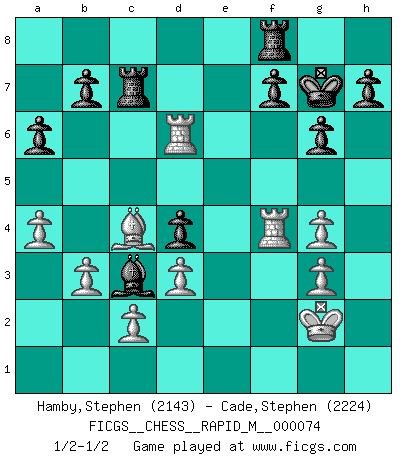 Last move : 1/2-1/2 2014 October 6 11:57:40 [Event "FICGS__CHESS__RAPID_M__000074"] [Site "FICGS"] [Date "2014.07.15"] [Round "1"] [White "Hamby,Stephen"] [Black "Cade,Stephen"] [Result "1/2-1/2"] [WhiteElo "2143"] [BlackElo "2224"] 1.Nf3 c5 2.b3 d6 3.Bb2 e5 4.Nc3 Nc6 5.e4 Nf6 6.Bc4 Be7 7.h3 a6 8.a4 O-O 9.O-O Be6 10.d3 Qd7 11.Nd2 Rae8 12.Rb1 Bd8 13.f4 exf4 14.Rxf4 Nd4 15.Rf2 d5 16.exd5 Nxd5 17.Nxd5 Bxd5 18.Bxd4 cxd4 19.Qg4 Qxg4 20.hxg4 Bc6 21.Rbf1 Re7 22.Nf3 Bxf3 23.Rxf3 Ba5 24.Rf5 Bd2 25.Rd5 g6 26.g3 Kg7 27.Kg2 Bc3 28.Rf4 Rc7 29.Rd6 1/2-1/2 Reti Opening Kingside Castling by player Black (move 8) Kingside Castling by player White (move 9) This chess game ended in a draw. Follow this game move after move (download)No Chess Grandmaster is normal; they only differ in the extent of their madness. (Viktor Korchnoi) Dieses schreckliche Gefühl, dass ich gegen eine Maschine spielte, die niemals Fehler macht, zerschmetterte meinen Widerstand. (Mark Taimanov) El jugador blanco perdió porque fallo en recordar la coreccta continuación y tuvo que pensar por sí mismo las movidas. (Siegbert Tarrasch) Je menace de comprendre la position. (Anonyme) Excelling at chess has long been considered a symbol of more general intelligence. That is an incorrect assumption in my view, as pleasant as it might be. But for the purposes of argument and investigation, chess is, in Russkin-Gutman's words, 'an unparalleled laboratory, since both the learning process and the degree of ability obtained can be objectified and quantified, providing an excellent comparative framework on which to use rigorous analytical techniques.' (The Chess Master and the Computer, by Garry Kasparov - 2010)