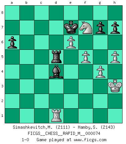 Last move : 1-0 2014 December 1 6:41:27 [Event "FICGS__CHESS__RAPID_M__000074"] [Site "FICGS"] [Date "2014.07.15"] [Round "1"] [White "Simashkevitch,Mykola"] [Black "Hamby,Stephen"] [Result "1-0"] [WhiteElo "2111"] [BlackElo "2143"] 1.e4 Nf6 2.e5 Nd5 3.d4 d6 4.Nf3 dxe5 5.Nxe5 c6 6.Be2 Bf5 7.O-O Nd7 8.Nf3 e6 9.c4 N5b6 10.Nc3 Be7 11.Bd3 Bxd3 12.Qxd3 Qc7 13.c5 Nd5 14.Nxd5 cxd5 15.b4 a6 16.g3 Qc8 17.Bf4 O-O 18.Rfe1 Rd8 19.a4 Nf6 20.b5 Nh5 21.Be3 Nf6 22.Rec1 Ne4 23.b6 f6 24.Ne1 e5 25.f3 Ng5 26.Bxg5 fxg5 27.dxe5 g4 28.fxg4 Bxc5+ 29.Kg2 Qc6 30.a5 d4 31.Nf3 Rd5 32.Qe4 d3 33.Rc4 Rad8 34.Rd1 Qg6 35.Qf5 Bf8 36.Rc7 Rxa5 37.Rxb7 Rb5 38.h4 Qxf5 39.gxf5 Bc5 40.e6 Rxb6 41.Rc7 Rb2+ 42.Kh3 Bb6 43.Rf7 d2 44.Ng5 Rb8 45.Ne4 Rb4 46.Nxd2 Rd4 47.Rd7 Kf8 48.Rxd4 Bxd4 49.Nc4 Rd8 50.Ne5 Rd6 51.Nf7 Rd5 52.g4 Ke7 53.h5 1-0 Alekhine's defense : Modern, Larsen variation Kingside Castling by player White (move 7) Kingside Castling by player Black (move 17) Player White won this chess game. Follow this game move after move (download)Fischer, who may or may not be mad as a hatter, has every right to be horrified. (Jeremy Silman) Wer sich die Fähigkeit anerziehen will im Schach selbstständig zu denken, der muß alles meiden, was leblos ist: ausgeklügelte Theorien, die sich auf sehr wenige Beispiele und eine Menge Hirngespinste stützen. (Emanuel Lasker) No existe un remordimiento como el remordimiento del Ajedrez. (H. G. Wells) La menace est plus forte que l'exécution. (Aaron Nimzovitch) Imagination is more important than knowledge. Knowledge is limited. Imagination encircles the world. (Albert Einstein)