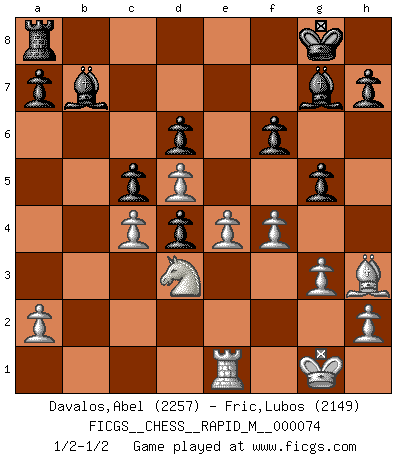 Last move : 1/2-1/2 2014 September 23 10:6:31 [Event "FICGS__CHESS__RAPID_M__000074"] [Site "FICGS"] [Date "2014.07.15"] [Round "1"] [White "Davalos,Abel"] [Black "Fric,Lubos"] [Result "1/2-1/2"] [WhiteElo "2257"] [BlackElo "2149"] 1.d4 Nf6 2.c4 e6 3.g3 Be7 4.Nf3 b6 5.Bg2 Bb7 6.O-O O-O 7.Nc3 Ne4 8.Qc2 Nxc3 9.Qxc3 c5 10.Rd1 d6 11.b3 Bf6 12.Bb2 Qe7 13.Qc2 Nc6 14.e4 e5 15.d5 Nd4 16.Bxd4 exd4 17.Rab1 Rae8 18.Ne1 g5 19.Nd3 Bc8 20.Re1 Bg7 21.b4 Qd8 22.bxc5 bxc5 23.Qa4 Re7 24.Qc6 f6 25.Rb8 Rc7 26.Qa4 Qd7 27.Qb3 Rb7 28.Rxb7 Qxb7 29.Qxb7 Bxb7 30.Bh3 Ra8 31.f4 1/2-1/2 Catalan Opening Kingside Castling by player White (move 6) Kingside Castling by player Black (move 6) This chess game ended in a draw. Follow this game move after move (download)There must have been a time when men were demigods, or they could not have invented Chess. (Gustav Schenk) Habe Mut, dich deines eigenen Verstandes zu bedienen. (Immanuel Kant) El Ajedrez tiene tanto misterio como las mujeres. (Purdy) Même si vous avez un bon coup à faire, regardez toujours s'il n'y en a pas un qui lui soit préférable. (Pedro Damiano) Question: Is 'This statement is paradoxical' a paradoxical statement ? Or is it a meta-paradox ? (Normajean Yates)