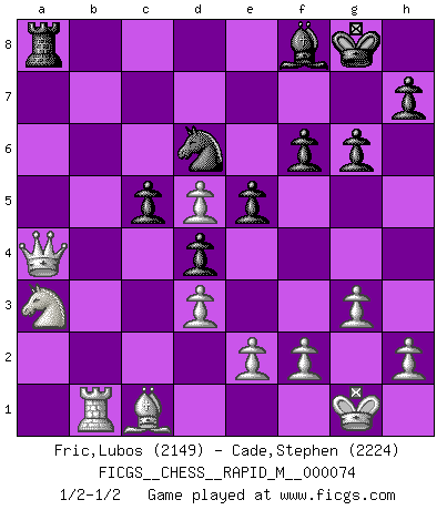 Last move : 1/2-1/2 2014 September 13 12:5:56 [Event "FICGS__CHESS__RAPID_M__000074"] [Site "FICGS"] [Date "2014.07.15"] [Round "1"] [White "Fric,Lubos"] [Black "Cade,Stephen"] [Result "1/2-1/2"] [WhiteElo "2149"] [BlackElo "2224"] 1.Nf3 c5 2.g3 Nc6 3.Bg2 e5 4.c4 g6 5.O-O Bg7 6.Nc3 Nge7 7.d3 d6 8.Rb1 O-O 9.a3 a5 10.Bg5 f6 11.Bd2 Be6 12.Ne1 d5 13.b3 b6 14.Nc2 d4 15.Nb5 Qd7 16.b4 axb4 17.axb4 Bh3 18.Bxh3 Qxh3 19.Nc7 Ra7 20.Nd5 Nxd5 21.cxd5 Nd8 22.bxc5 bxc5 23.Qc1 Nf7 24.Na3 Ra6 25.Rb7 Qc8 26.Qb2 Nd6 27.Rb6 Qa8 28.Rxa6 Qxa6 29.Rb1 Ra8 30.Bc1 Bf8 31.Qc2 Qa4 32.Qxa4 1/2-1/2 Reti Opening Kingside Castling by player White (move 5) Kingside Castling by player Black (move 8) This chess game ended in a draw. Follow this game move after move (download)My God, Bobby Fischer plays so simply. (Alexei Suetin) Es ist peinlich, dass ich nie Weltmeister wurde. Es wäre leicht, Leonid Breschnjew als Ursache vorzuschieben, dessen Apparat den Vorzeigekommunisten Anatoli Karpow in allem unterstützte. Aber Garri Kasparow zum Beispiel, der ebenfalls von den Sowjets unerwünscht war, hat trotz der Widerstände den WM-Titel erobert. (Viktor Kortschnoi) Fischer es el jugador mas fuerte del mundo. De hecho, el jugador mas fuerte que jamas haya existido. (Larry Evans) Dieu déplace le joueur, et celui-ci la pièce. Quel Dieu derrière Dieu commence donc la trame ? Arturo Perez-Reverte (prix de littérature policière 1993). We need strong personalities and only one world champion to attract sponsors. (Anatoly Karpov)