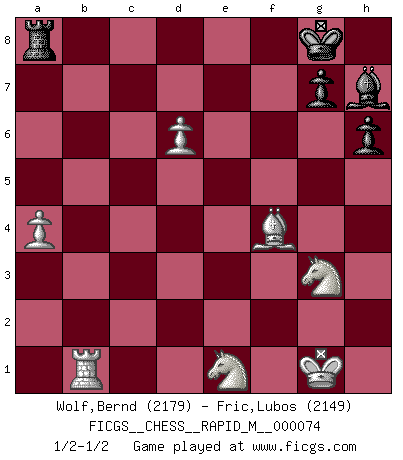 Last move : 1/2-1/2 2014 November 12 8:11:3 [Event "FICGS__CHESS__RAPID_M__000074"] [Site "FICGS"] [Date "2014.07.15"] [Round "1"] [White "Wolf,Bernd"] [Black "Fric,Lubos"] [Result "1/2-1/2"] [WhiteElo "2179"] [BlackElo "2149"] 1.e4 e5 2.Nf3 Nc6 3.Bb5 a6 4.Ba4 Nf6 5.O-O Be7 6.Re1 b5 7.Bb3 d6 8.c3 O-O 9.h3 Nb8 10.d4 Nbd7 11.c4 c6 12.Nc3 b4 13.Na4 c5 14.d5 a5 15.a3 h6 16.Bc2 Re8 17.Nd2 Nh7 18.b3 Ndf8 19.Nb2 Bd7 20.Nd3 Ng6 21.Bb2 Ng5 22.Re3 Rf8 23.Nf1 Nh4 24.axb4 cxb4 25.Ng3 Nxh3+ 26.gxh3 Bg5 27.Qe2 Bxe3 28.Qxe3 Bxh3 29.Ne1 f5 30.exf5 Nxf5 31.Bxf5 Bxf5 32.c5 Rf7 33.cxd6 Qxd6 34.Qxe5 Qxe5 35.Bxe5 Bh7 36.f4 a4 37.bxa4 b3 38.d6 Rxf4 39.Bxf4 b2 40.Rd1 b1Q 41.Rxb1 1/2-1/2 Ruy Lopez : Closed Kingside Castling by player White (move 5) Kingside Castling by player Black (move 8) Promotion Queen by player Black (move 40) This chess game ended in a draw. Follow this game move after move (download)It is not enough to be a good player... you must also play well. (Siegbert Tarrasch) Der Umstand, daß uns eine 7 Stunden Zeitkontrolle ermöglicht eine großartige, tiefe Partie zu spielen, ist für die Massenmedien nicht weiter von Bedeutung. (Alexej Shirov) El Ajedrez es el arte del análisis. (Mikhail Botvinnik) Le temps de noter son nom sur la feuille de partie, j'étais déjà en zeitnot ! D'un modeste amateur apparié lors de la première ronde d'un open contre le grand-maître Azmaïparashvili. Hardware: the parts of a computer that can be kicked. (Jeff Persis)