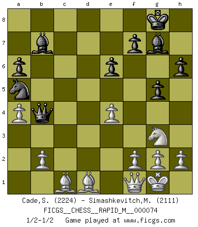 Last move : 1/2-1/2 2014 August 11 14:43:49 [Event "FICGS__CHESS__RAPID_M__000074"] [Site "FICGS"] [Date "2014.07.15"] [Round "1"] [White "Cade,Stephen"] [Black "Simashkevitch,Mykola"] [Result "1/2-1/2"] [WhiteElo "2224"] [BlackElo "2111"] 1.d4 d5 2.c4 c6 3.Nf3 Nf6 4.Nc3 e6 5.Bg5 h6 6.Bh4 dxc4 7.e4 g5 8.Bg3 b5 9.Be2 Bb7 10.O-O Nbd7 11.Ne5 Bg7 12.Nxd7 Nxd7 13.Bd6 a6 14.a4 b4 15.Bxb4 Qb6 16.Ba3 Qxd4 17.Qc2 c5 18.Rfd1 Qe5 19.Bxc4 Qc7 20.Ne2 O-O 21.Ng3 Rfd8 22.Rac1 Ne5 23.Be2 c4 24.Bb4 Nc6 25.Bd2 Rac8 26.Qb1 Qb6 27.Bxc4 Na5 28.Be2 Rxc1 29.Bxc1 Rxd1+ 30.Bxd1 Qb4 31.Qd3 Qe1+ 32.Qf1 Qb4 1/2-1/2 QGD Slav : 4.Nc3 Kingside Castling by player White (move 10) Kingside Castling by player Black (move 20) This chess game ended in a draw. Follow this game move after move (download)Some part of a mistake is always correct. (Savielly Tartakover) Der Traum, für den ich lebe, ist der von einem freien Russland. Viele mögen sagen: Russland hat doch ein Parlament, einen gewählten Präsidenten. Aber ich spüre, dass in meiner Heimat die Angst wiederkehrt. Eine Angst, sich frei zu äußern, bestimmte Dinge zu tun (Garry Kasparov) Yo jugué Ajedrez con el y a veces le pude haber ganado solo que siempre devuelve su última jugada y juega la partida de manera diferente. (Mark Twain) 'L'échange des dames est un coup dur pour les deux adversaires...' Un journaliste lors d'une partie du match Spassky-Fischer If passion drives you, let reason holds the reins. (Benjamin Franklin)