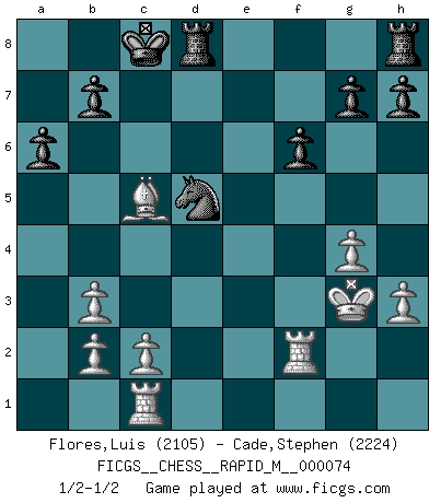 Last move : 1/2-1/2 2014 September 22 15:43:7 [Event "FICGS__CHESS__RAPID_M__000074"] [Site "FICGS"] [Date "2014.07.15"] [Round "1"] [White "Flores,Luis"] [Black "Cade,Stephen"] [Result "1/2-1/2"] [WhiteElo "2105"] [BlackElo "2224"] 1.e4 c5 2.Nf3 d6 3.d4 cxd4 4.Nxd4 Nf6 5.Nc3 a6 6.Be3 e5 7.Nb3 Be6 8.h3 Be7 9.f4 Nc6 10.f5 Bxb3 11.axb3 Nb4 12.g3 Qc8 13.Bg2 d5 14.exd5 Qxf5 15.Rc1 e4 16.g4 Qd7 17.Nxe4 Nfxd5 18.Bf2 Qc7 19.O-O Nf4 20.Bg3 Qb6+ 21.Rf2 Nxg2 22.Nd6+ Bxd6 23.Qxd6 Qxd6 24.Bxd6 Nd5 25.Kxg2 O-O-O 26.Bc5 f6 27.Kg3 1/2-1/2 Sicilian : Najdorf, Byrne (English) attack Kingside Castling by player White (move 19) Queenside Castling by player Black (move 25) This chess game ended in a draw. Follow this game move after move (download)Examine moves that smite! A good eye for smites is far more important than a knowledge of strategical principles. (Purdy) Warum muß ich gegen diesen IDIOTEN verlieren? (Aaron Nimzowitsch) El Ajedrez te enseña a controlarl la excitación inicial que sientes cuando vez algo que parece bueno y te enseña a pensar objetivamente cuando te encuentras en problemas. (Stanley Kubrick) J'ai toujours senti une vague pitié pour l'homme qui ne connaît rien aux échecs, tout comme j'en aurais pour un homme ignorant de l'amour. Les Echecs, comme la musique ou comme l'amour, ont le pouvoir de rendre heureux. (Siegbert Tarrasch) Every man's memory is his private literature. (Aldous Huxley)