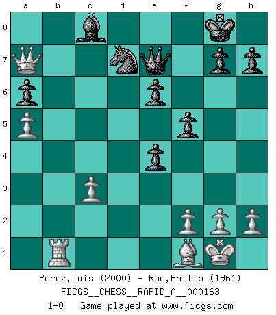 Last move : 1-0 2014 October 16 21:42:10 [Event "FICGS__CHESS__RAPID_A__000163"] [Site "FICGS"] [Date "2014.07.17"] [Round "1"] [White "Perez,Luis"] [Black "Roe,Philip"] [Result "1-0"] [WhiteElo "2000"] [BlackElo "1961"] 1.e4 c5 2.Nf3 e6 3.d4 cxd4 4.Nxd4 a6 5.Bd3 b5 6.a4 b4 7.O-O Bb7 8.Nd2 Nc6 9.Nxc6 Bxc6 10.Re1 Nf6 11.a5 Be7 12.Nc4 d5 13.Nb6 dxe4 14.Nxa8 Qxa8 15.Bf1 O-O 16.c3 bxc3 17.bxc3 Nd7 18.Qe2 Bb7 19.Rd1 Qc8 20.Bf4 Nc5 21.Qe3 Qc6 22.Rab1 Rc8 23.Rb6 Qe8 24.Rdb1 Bc6 25.Rb8 Bd7 26.Qd4 f5 27.Rxc8 Bxc8 28.Bd6 Nd7 29.Bxe7 Qxe7 30.Qa7 1-0 Sicilian : Kan, 5.Bd3 Kingside Castling by player White (move 7) Kingside Castling by player Black (move 15) Player White won this chess game. Follow this game move after move (download)Let the perfectionist play postal. (Yasser Seirawan) Capablanka war das größte Genie der Schachgeschichte! Aber denken sie nicht er habe nichts vom Schach verstanden. Er wusste nur soviel wie er wissen musste um seine Ziele zu erreichen. (Mikhail Moiseyevich Botvinik) Desconfianza es la característica mas necesaria de un jugador de Ajedrez. (Siegbert Tarrasch) Aucun coup ne doit être joué sans but. (Pedro Damiano) Experience is the name we all give to our mistakes. (Oscar Wilde)