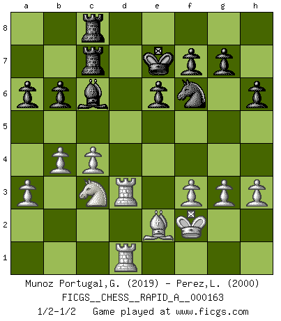 Last move : 1/2-1/2 2014 August 22 4:57:53 [Event "FICGS__CHESS__RAPID_A__000163"] [Site "FICGS"] [Date "2014.07.17"] [Round "1"] [White "Munoz Portugal,Guillermo"] [Black "Perez,Luis"] [Result "1/2-1/2"] [WhiteElo "2019"] [BlackElo "2000"] 1.e4 d5 2.exd5 Nf6 3.d4 Nxd5 4.c4 Nf6 5.Nf3 c5 6.Nc3 cxd4 7.Qxd4 Qxd4 8.Nxd4 a6 9.Bf4 Nbd7 10.Nf3 e6 11.Be2 b6 12.O-O Bb7 13.Rfd1 Be7 14.Rd3 Rc8 15.Rad1 Rg8 16.g3 Bc6 17.Ne5 Nxe5 18.Bxe5 Bc5 19.a3 Nd7 20.Bd6 Bxd6 21.Rxd6 Ke7 22.b4 Nf6 23.f3 Rc7 24.Kf2 h6 25.h3 Rgc8 26.R6d3 1/2-1/2 Scandinavian : Marshall variation Kingside Castling by player White (move 12) This chess game ended in a draw. Follow this game move after move (download)Many Chess players were surprised when after the game, Fischer quietly explained: 'I had already analyzed this possibility' in a position which I thought was not possible to foresee from the opening. (Mikhail Tal) Kleine Schachspieler machen Mist, und große Schachspieler machen Mist, aber große machen weniger Mist. (Fritz Sämisch) Haz el enroque temprano y seguido. (Rob Sillars) A ce moment-là, je menaçais de comprendre la position ! (Clément L'Heureux) Experiences are the keys to life. (Daniel Parmet)