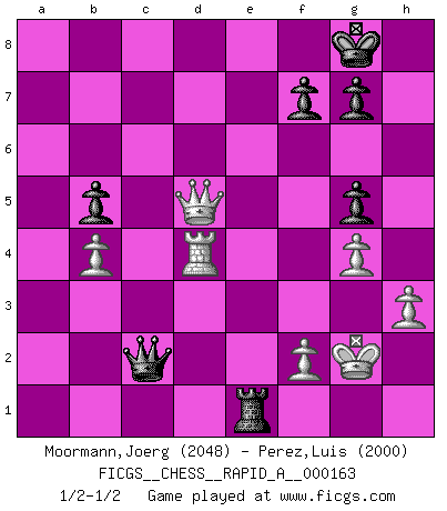 Last move : 1/2-1/2 2014 November 4 20:21:3 [Event "FICGS__CHESS__RAPID_A__000163"] [Site "FICGS"] [Date "2014.07.17"] [Round "1"] [White "Moormann,Joerg"] [Black "Perez,Luis"] [Result "1/2-1/2"] [WhiteElo "2048"] [BlackElo "2000"] 1.e4 d5 2.exd5 Nf6 3.Nf3 Nxd5 4.d4 Bf5 5.Bd3 Bxd3 6.Qxd3 e6 7.O-O c6 8.c4 Nf6 9.Nc3 Be7 10.Bf4 O-O 11.Rad1 Re8 12.Rfe1 Nbd7 13.h3 Qb6 14.a3 Nf8 15.g4 h6 16.Ne5 N6d7 17.Nxd7 Nxd7 18.b4 Nf6 19.d5 cxd5 20.cxd5 Nxd5 21.Nxd5 exd5 22.Qxd5 Bh4 23.Qf3 Rxe1+ 24.Rxe1 a5 25.Be3 Qb5 26.Rb1 Bg5 27.Bxg5 hxg5 28.Re1 Qc6 29.Qb3 axb4 30.axb4 b5 31.Rd1 Re8 32.Qd5 Qc2 33.Rd4 Re1+ 34.Kg2 1/2-1/2 Scandinavian defense Kingside Castling by player White (move 7) Kingside Castling by player Black (move 10) This chess game ended in a draw. Follow this game move after move (download)Best by test: 1. e4 (Bobby Fischer) Strategie ist, wie man ein Mädchen auf den Rücksitz bekommt. Taktik ist, was man tut, wenn man dann dort ist. (Anonymous) La señal de un Gran Maestro es su habilidad de ganar una partida rápidamente y sin dolor. (Irving Chernev) Les ravages du H expliquent la différence de niveau entre Tal et Thal [Abergel]. Good decisions come from experience, and experience comes from bad decisions. (Anonymous)