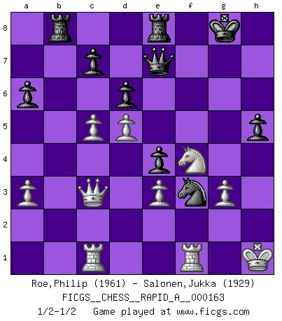 Last move : 1/2-1/2 2014 September 23 3:26:54 [Event "FICGS__CHESS__RAPID_A__000163"] [Site "FICGS"] [Date "2014.07.17"] [Round "1"] [White "Roe,Philip"] [Black "Salonen,Jukka"] [Result "1/2-1/2"] [WhiteElo "1961"] [BlackElo "1929"] 1.c4 Nf6 2.Nc3 e5 3.g3 Nc6 4.Bg2 Bc5 5.a3 O-O 6.e3 a6 7.Nge2 d6 8.O-O Re8 9.d4 Ba7 10.b4 Bg4 11.d5 Ne7 12.Qd3 Ng6 13.e4 Bd7 14.Nd1 h5 15.Bg5 Nf8 16.h4 N8h7 17.Bd2 Qe7 18.Rc1 Ng4 19.Kh1 f5 20.exf5 e4 21.Qc3 Bxf5 22.Ne3 Bxe3 23.Bxe3 Nxe3 24.fxe3 Bg4 25.Nf4 g5 26.hxg5 Nxg5 27.c5 Nf3 28.Bh3 Bxh3 29.Nxh3 b6 30.Nf4 bxc5 31.bxc5 Rab8 1/2-1/2 English Opening Kingside Castling by player Black (move 5) Kingside Castling by player White (move 8) This chess game ended in a draw. Follow this game move after move (download)A thorough understanding of the typical mating continuations makes the most complicated sacrificial combinations leading up to them not only not difficult, but almost a matter of course. (Siegbert Tarrasch) Schach ist die gewalttätigste aller Sportarten. (Garry Kasparov) Yo no creo en la psicología. Yo creo en las buenas movidas. (Bobby Fischer) Seul un grand joueur sait à quel point il joue faiblement. (Xavier Tartacover) Two beer, or not two beer. (Unknown)