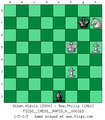 Last move : 1/2-1/2 2014 August 21 23:31:26 [Event "FICGS__CHESS__RAPID_A__000163"] [Site "FICGS"] [Date "2014.07.17"] [Round "1"] [White "Alban,Alexis"] [Black "Roe,Philip"] [Result "1/2-1/2"] [WhiteElo "2000"] [BlackElo "1961"] 1.d4 d5 2.c4 e6 3.Nf3 Nf6 4.Nc3 Be7 5.Bf4 O-O 6.e3 Nbd7 7.c5 Nh5 8.Bd3 Nxf4 9.exf4 b6 10.b4 a5 11.a3 c6 12.O-O Ba6 13.Bxa6 Rxa6 14.Qe2 b5 15.Ra2 Ra8 16.Rfa1 Qc7 17.a4 axb4 18.axb5 Qb7 19.Nb1 Rxa2 20.Rxa2 Ra8 21.Rxa8+ Qxa8 22.f5 e5 23.bxc6 Qxc6 24.Nxe5 Nxe5 25.Qxe5 Qa4 26.Qb8+ Bf8 27.Nd2 Qd1+ 28.Nf1 b3 29.c6 Qc2 30.c7 b2 31.c8Q Qxc8 32.Qxc8 b1Q 33.f6 gxf6 34.Qg4+ Bg7 35.Qf3 Qa2 36.g3 Qc4 37.Qf4 f5 38.Ne3 Qxd4 39.Qxf5 Qe4 40.Nxd5 Qxf5 41.Ne7+ Kf8 42.Nxf5 Bc3 43.Kg2 f6 44.Kf3 Kf7 45.Ke4 Ba5 46.f3 Bb6 47.Nd4 Kg6 48.Ne6 Kf7 49.Kf5 Bg1 50.h3 Bf2 51.g4 Be3 52.h4 Bf2 53.h5 Be1 54.g5 fxg5 55.Nxg5+ Kg7 56.Nxh7 1/2-1/2 Queen's gambit declined Kingside Castling by player Black (move 5) Kingside Castling by player White (move 12) Promotion Queen by player White (move 31) Promotion Queen by player Black (move 32) 10 pieces endgame at move 40 : White KNPPP , Black KQBPP WHITE : King + 1 Knight 3 Pawns BLACK : King + 1 Queen 1 Bishop 2 Pawns 9 pieces endgame at move 42 : White KNPPP , Black KBPP WHITE : King + 1 Knight 3 Pawns BLACK : King + 1 Bishop 2 Pawns 8 pieces endgame at move 54 : White KNPP , Black KBPP WHITE : King + 1 Knight 2 Pawns BLACK : King + 1 Bishop 2 Pawns 7 pieces endgame at move 55 : White KNPP , Black KBP WHITE : King + 1 Knight 2 Pawns BLACK : King + 1 Bishop 1 Pawn 6 pieces endgame at move 56 : White KNPP , Black KB WHITE : King + 1 Knight 2 Pawns BLACK : King + 1 Bishop This chess game ended in a draw. Follow this game move after move (download)One doesn't have to play well, it's enough to play better than your opponent. (Siegbert Tarrasch) Das Schach ist nichts für kleine Geister, es beansprucht einen vollen Mann, der sich nicht sklavisch an das Überlieferte hält, sondern selbständig die Tiefen des Spiels zu ergründen sucht. (Wilhelm Steinitz) Cualquier cambio de material en una posición debe venir por medio de un mate, una captura o promoción de Peón. (Purdy) Celui qui prend des risques peut perdre, celui qui n'en prend pas perd toujours. (Xavier Tartacover) Unless I accept my faults I will most certainly doubt my virtues. (Hugh Prather)