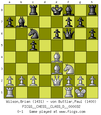 Last move : 0-1 2007 May 12 14:51:59 [Event "FICGS__CHESS__CLASS_D__000032"] [Site "FICGS"] [Date "2007.02.19"] [Round "1"] [White "Wilson,Brian"] [Black "von Buttlar,Paul"] [Result "0-1"] [WhiteElo "1431"] [BlackElo "1400"] 1.e4 e6 2.d4 d5 3.Nc3 dxe4 4.Nxe4 Nf6 5.Nxf6+ Qxf6 6.Nf3 h6 7.Bd3 c5 8.Be3 Nc6 9.O-O b6 10.Be4 Bb7 11.dxc5 bxc5 12.Qe2 Rc8 0-1 French : Rubinstein variation Kingside Castling by player White (move 9) Player Black won this chess game. Follow this game move after move (download)In Chess, at least, the brave inherit the earth. (Edmar Mednis) Ein unbeabsichtigtes Patt ist der Gipfel der Dummheit. (Anonymous) Aquellos que dicen entender al Ajedrez, no entienden nada. (Robert Hubner) Ce qui caractérise les parties de combat, c'est que si le défenseur a constamment de difficiles problèmes à résoudre, l'attaquant doit chercher sans relâche de nouvelles possibilités d'attaque. (Koblentz) There is no vagueness without wind. (Chinese proverb)